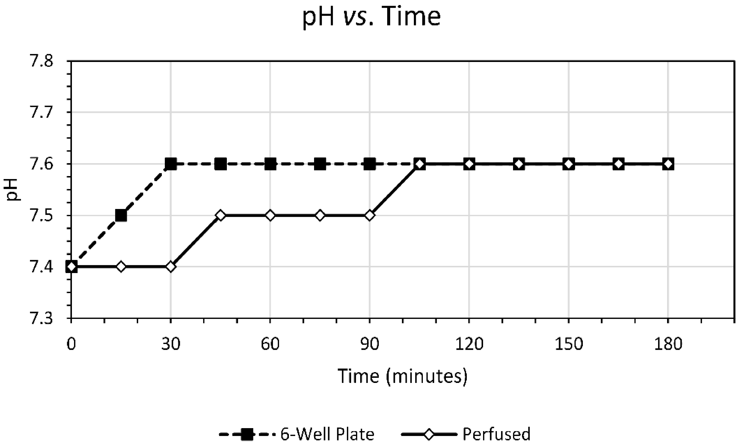 As can be seen in Figure 3, the temperature test shows that the 6-well plate equilibrates to the internal incubator temperature more quickly than the perfusion bioreactor chamber as would be expected. The perfusion chamber takes at least two hours for the temperature to equilibrate to the incubator and as such should be allowed to sit in the incubator for this time frame before introduction of cell culture. Figure 4 shows that pH tended to stay within a narrow range close to the accepted cell culture pH value of 7.4 which is supported by the fact that for both the 6-well plate and the perfusion chamber there was no perceptible change in the color of the DMEM. Also as expected, the 6-well plate reached the equilibrium pH of 7.6 at 30 min whereas it took over 100 min for the perfusion bioreactor chamber to reach the same value. This indicates that there is adequate gas exchange in both the perfusion bioreactor and media reservoir.