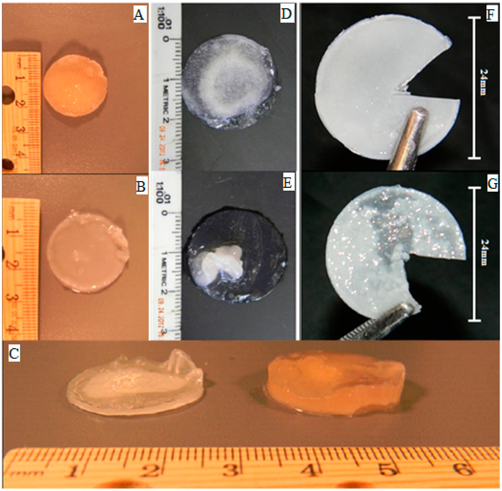 (A) Gross morphology of Method 1 perfused cartilage construct; (B) Gross morphology of Method 1 static cartilage construct; (C) Gross comparison of the differences in thickness between static and perfused constructs of Method 1; (D) Gross morphology of Method 2 perfused cartilage construct; (E) Gross morphology of Method 2 static cartilage construct; (F) Gross morphology of Method 3 perfused cartilage construct; (G) Gross morphology of Method 3 static cartilage construct.
