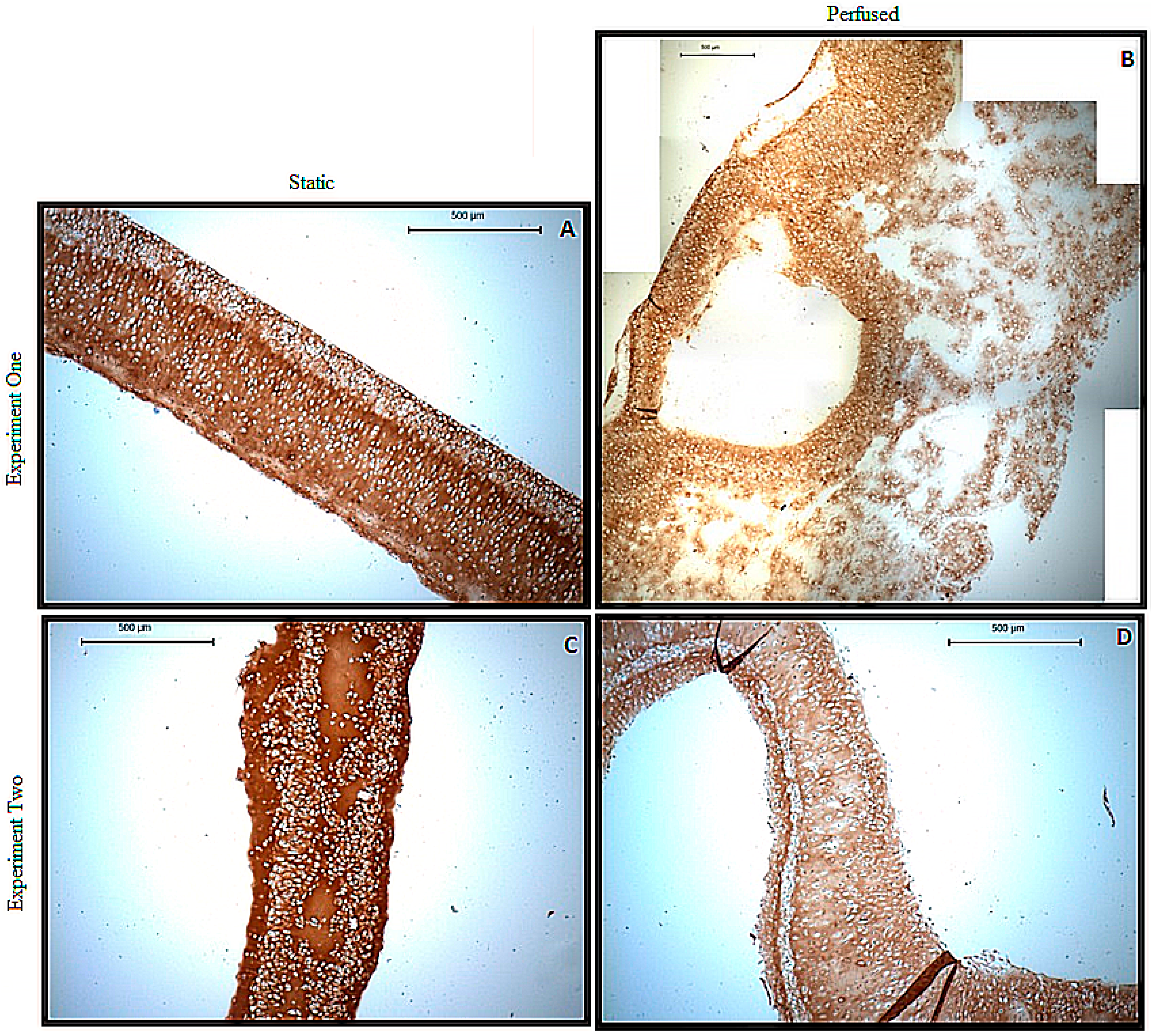 Type II collagen histology from Methods 1 and 2. (A) Method 1, Static; (B) Method 1, Perfused; (C) Method 2, Static; (D) Method 2, Perfused. * all scale bars are 500 μm.