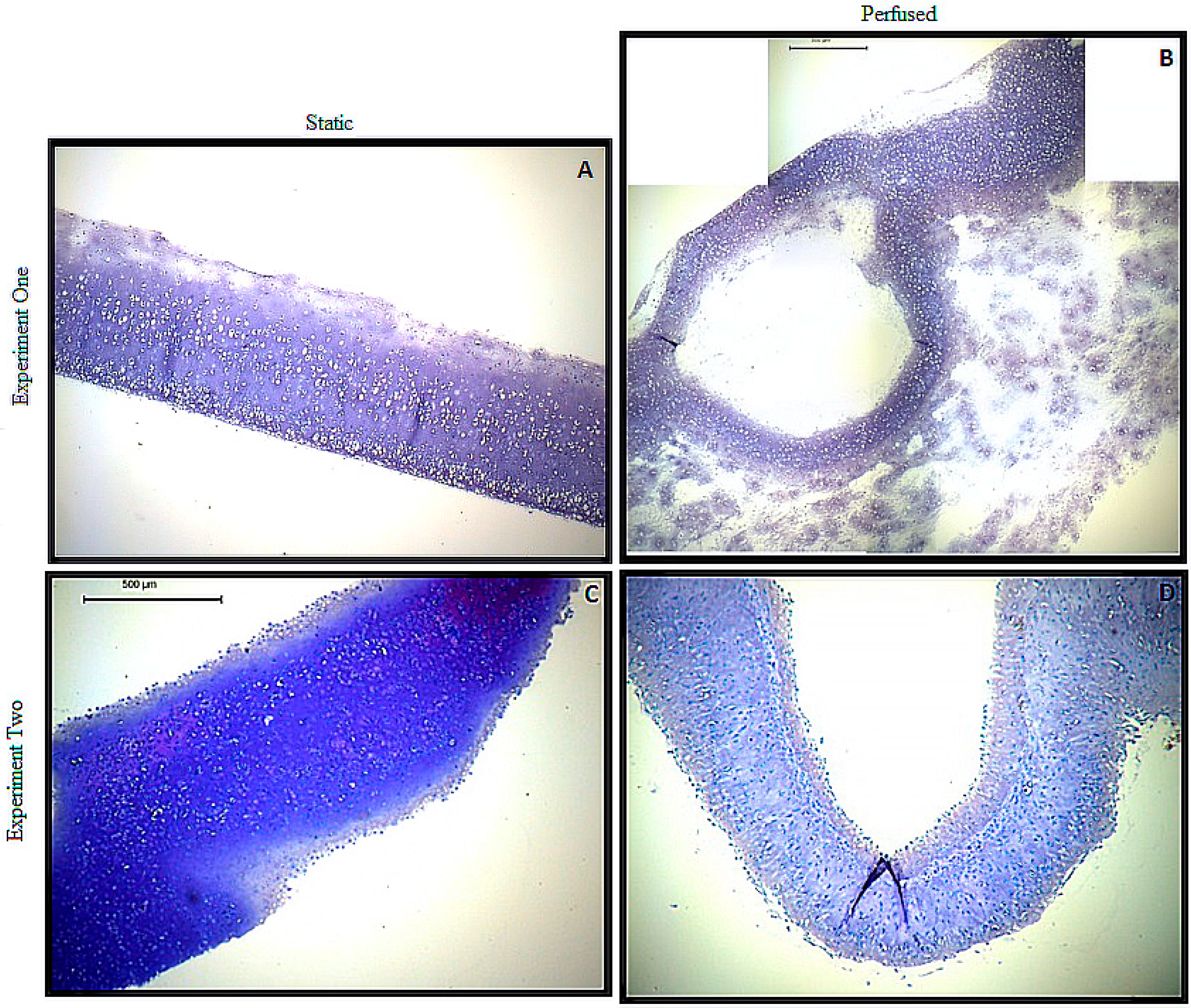 Toluidine Blue histology from Methods 1 and 2. (A) Method 1, Static; (B) Method 1, Perfused; (C) Method 2, Static; (D) Method 2, Perfused. * all scale bars are 500 μm.