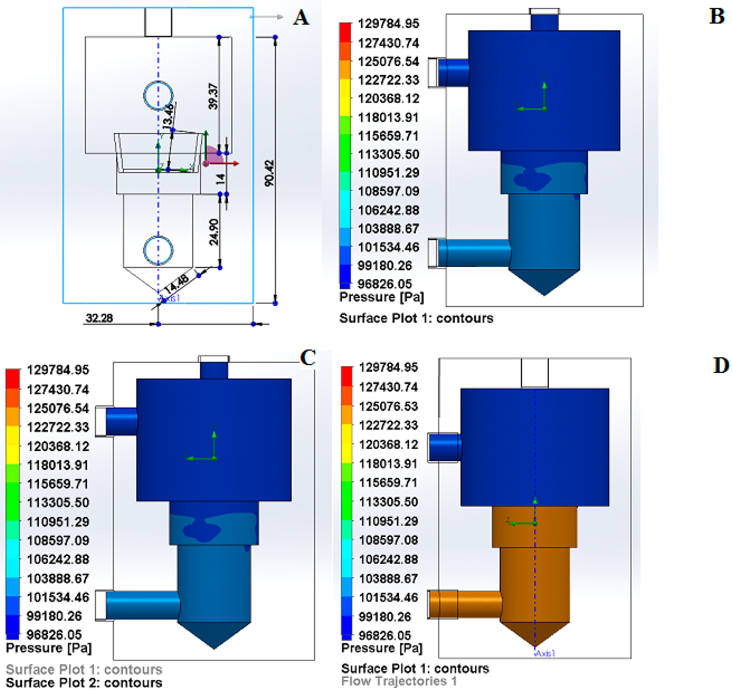 (A) Schematic of the bioreactor chamber with transwell in SolidWorks® (units in mm); (B) Surface contour plot of empty bioreactor; (C) Surface contour plot of bioreactor with simulated cell suspension in transwell insert; (D) Surface contour plot of bioreactor with simulated articular cartilage in transwell insert.