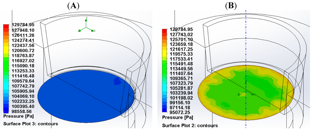 (A) A surface plot depicting the absolute pressure occurring radially across the transwell insert membrane having cell suspension permeability; (B) A surface plot depicting the absolute pressure occurring radially across the transwell insert membrane having articular cartilage permeability.