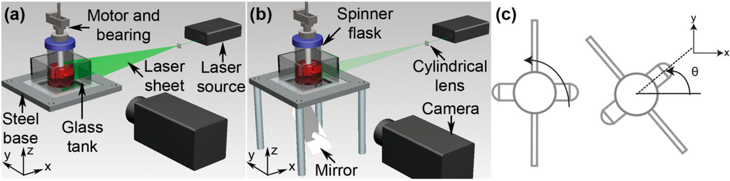 An Nd:YAG laser source and a cylindrical lens were used to create a thin laser sheet that illuminated the imaging plane. For meridional plane analysis, the laser sheet was aligned vertically (Figure 1a), whereas for azimuthal image acquisition procedure, the laser sheet was in a horizontal plane and a mirror was placed underneath the flask to reflect the scattered light in the fluid flow onto the camera sensor as shown in Figure 1b.