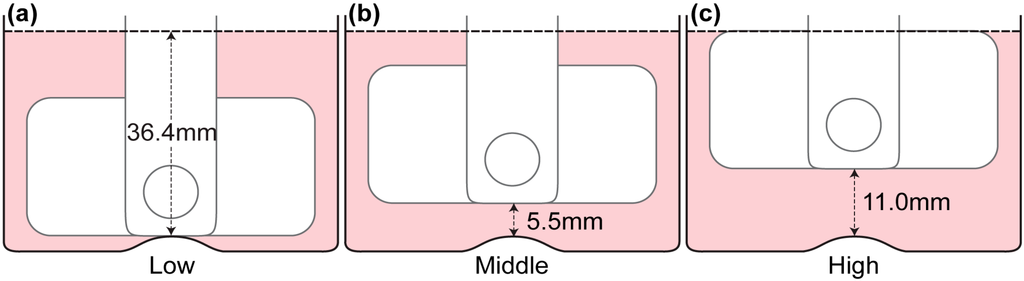 Impeller positions in the spinner flask. Throughout the experiment, the impeller height was varied at low, middle and high positions. (a) The impeller was positioned at its lowest possible location where the bottom of the impeller touches the bump at the bottom of the flask. (b) The impeller was placed at middle height where the distance of the bump to the impeller’s bottom edge is similar to the distance of the impeller’s top edge to the free surface at 5.5 mm. (c) The impeller is in “high” position when the top edge of the impeller is at the free surface and the bottom edge is 11 mm from the bump.