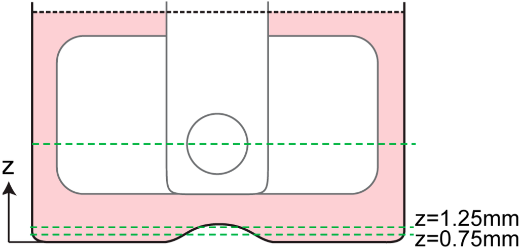 Locations of azimuthal measurements. A measurement was conducted at mid-height of the stirrer bar and two measurements were conducted near the bottom wall of the bioreactor, as represented by the dashed lines. Using the two velocity profiles at z = 0.75 mm and z = 1.25 mm, a parabolic profile was fitted and the velocity gradient near the bottom wall was estimated.