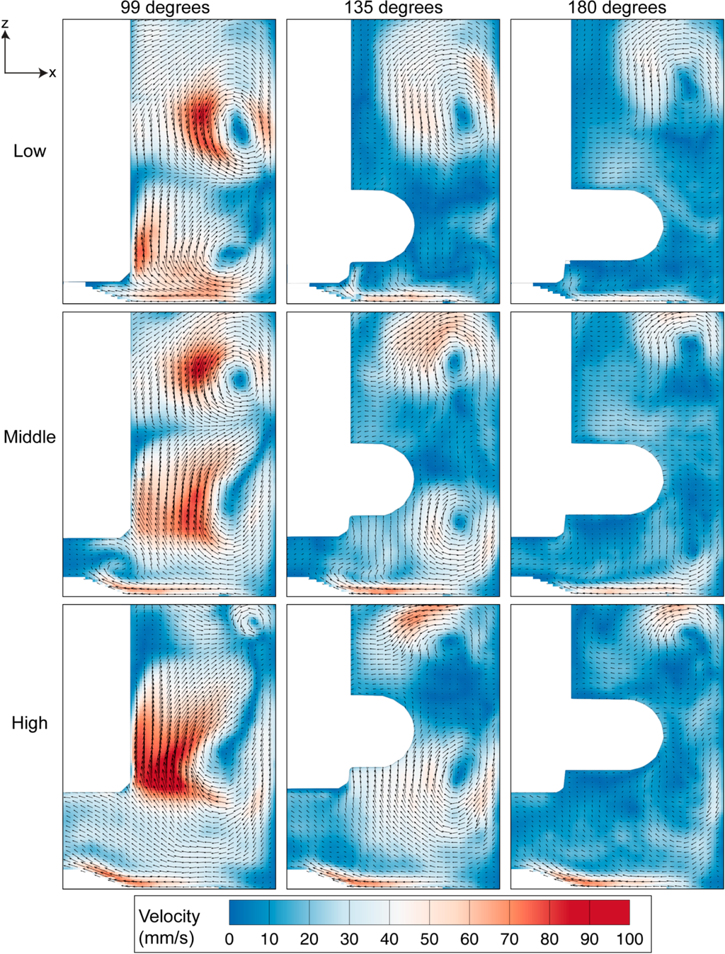The results are split into 3 s—meridional plane, azimuthal plane analysis and flow profile near the bottom surface of the flask. As there are minimal changes to flow structure at different rotational speeds, only one speed of the results is presented for visualization purposes in each section to highlight the main flow feature within the flask, due to the significant number of variables in the study. The analyses mainly focus on velocity profile, shear stress distribution and vorticity. In imaging planes where the impeller was present, the impeller was masked out and excluded in the PIV calculation.