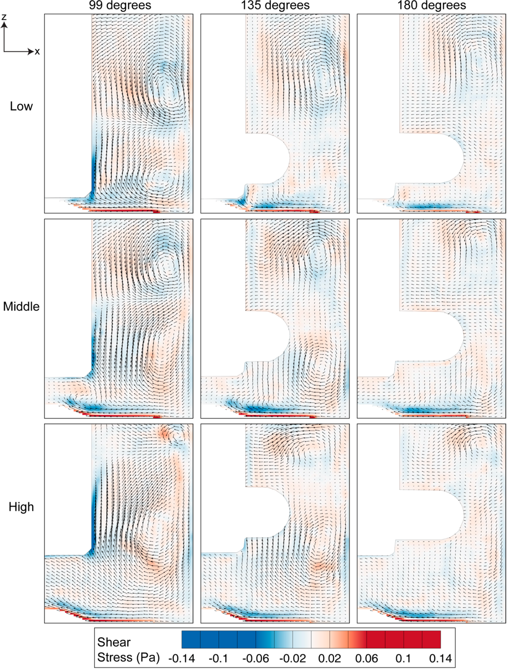 In the meridional plane, the shear stress is significant at the bottom surface of the flask and around the impeller shaft, as illustrated in Figure 7. With the highest fluid velocity occurring at 99 degrees, it is also clear that the magnitude of shear stress at this angular position is the most prominent relative to other angles. Additionally, the figure shows that the shear readings are strongly influenced by the fluid rotation in the lower part of the vessel. However, as the impeller is positioned at higher levels, the vortex is also located farther from the wall. With the vortex developed at a higher location, the fluid near the end wall is not severely affected by the recirculation phenomenon, thus producing lower shear margin at the base. The distribution of stress has not been presented in previous characterization studies [32,38]. The shear stress distribution within the spinner flask presented here would enable researchers to determine the critical location at which the shear stress is significant and its variation at different impeller angular positions.