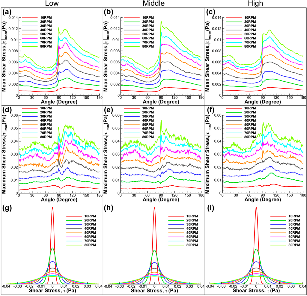 Shear stress plots for three impeller arrangements and spun at speeds varying from 10 RPM to 80 RPM. Evolution of mean (a–c) and maximum shear stress (d–f) for various speeds and rotation angles. In all plots, significant increase in shear stress magnitude was obtained at 90 degrees, an angle at which the flat impeller is in the imaging plane. (g–i) Distribution functions of shear stress at speeds between 10 RPM and 80 RPM for different impeller heights.