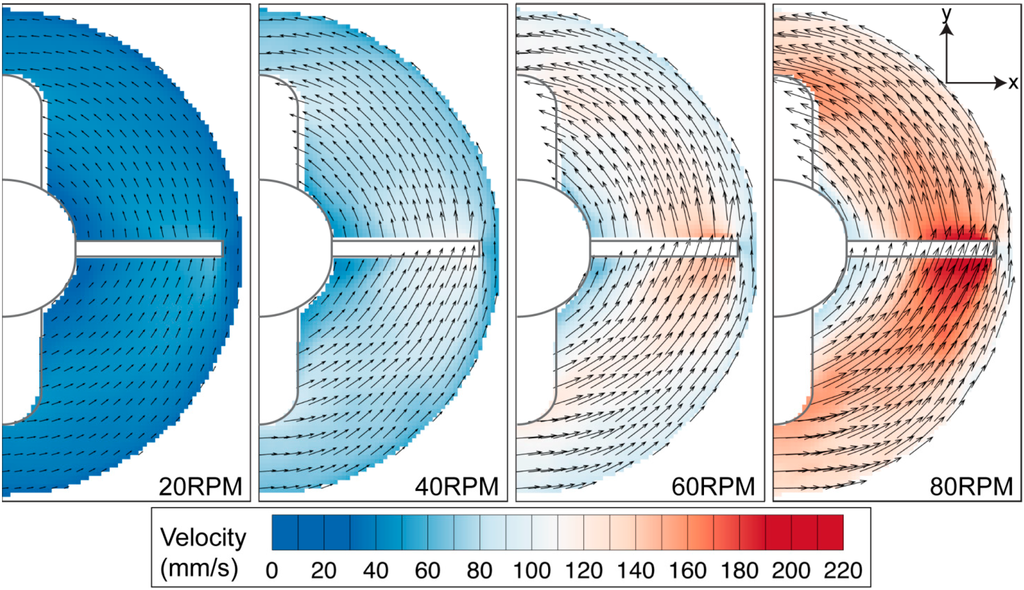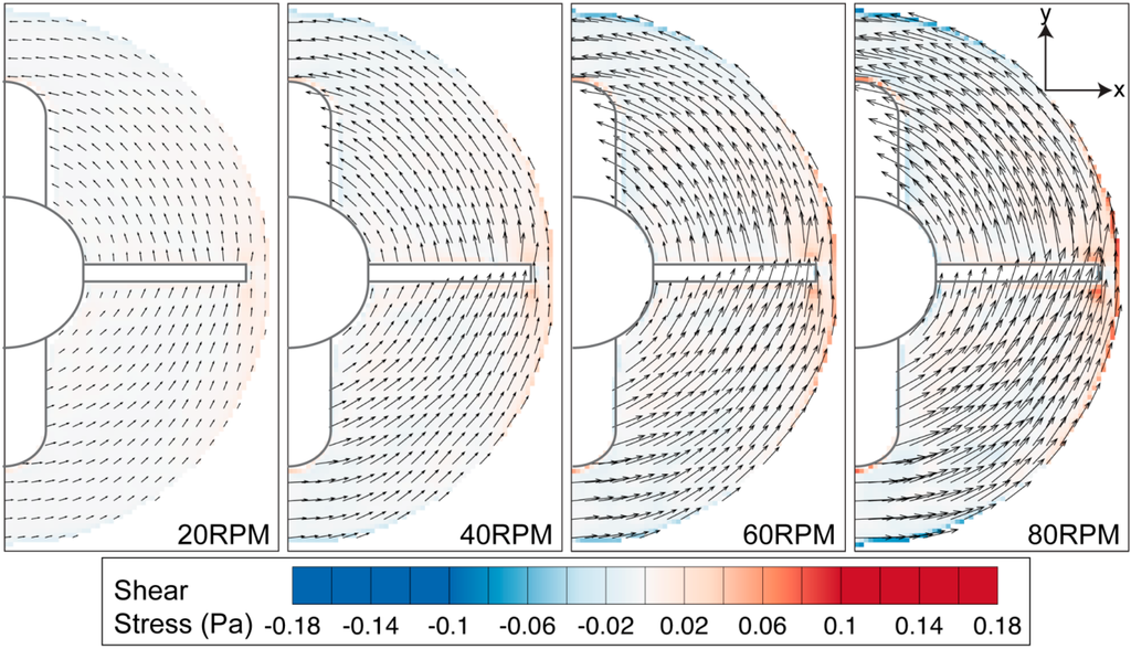 Velocity and shear stress profiles at middle height of the stir bar impeller are presented in Figure 9 and Figure 10, respectively. As the impeller was present in the imaging plane during the image acquisition process, the impeller was masked and removed from the PIV calculation. Figure 9 shows that the fluid flow increases with increasing stirring speed. Due to the fact that the azimuthal velocity is a function of radius and angular speed, it is not surprising to see that the maximum velocity is located at the tip of the flat paddle, similar to the findings in the literature [32,33]. As the main velocity component in the system, the velocity magnitude in the azimuthal plane is generally far greater than that in the meridional velocity. Minor radial motion can also be seen behind the impeller, which corresponds to the location of recirculation.