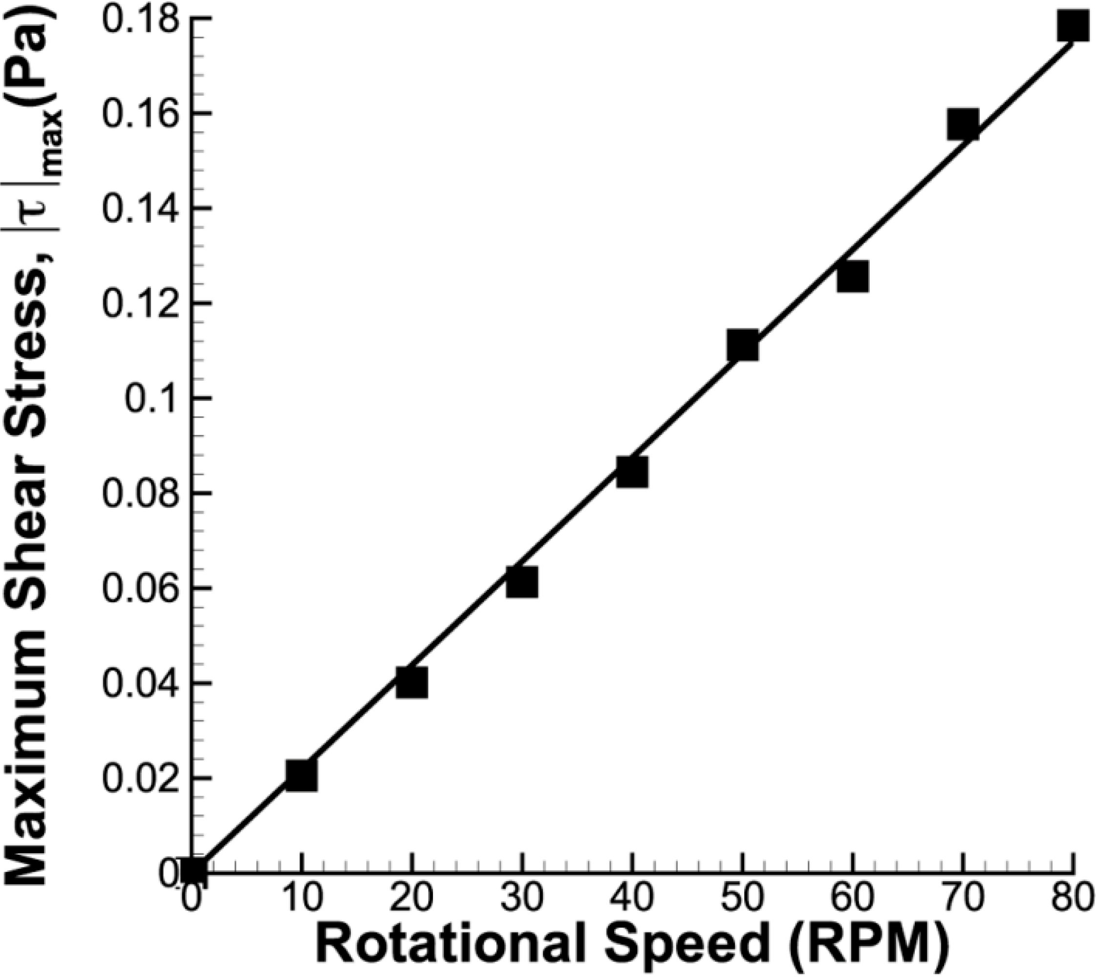The high tangential velocity creates a high velocity gradient at the sidewall, as illustrated in Figure 10. Furthermore, noticeable shear can also be observed at the edge of the stirring bar. Overall, the shear magnitude is greatly dependent on the rotational speed. Figure 11 shows that the maximum shear stress of each speed varies linearly to the stirring rate of the impeller.