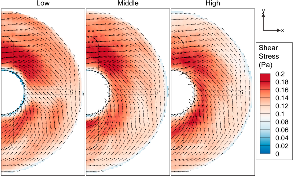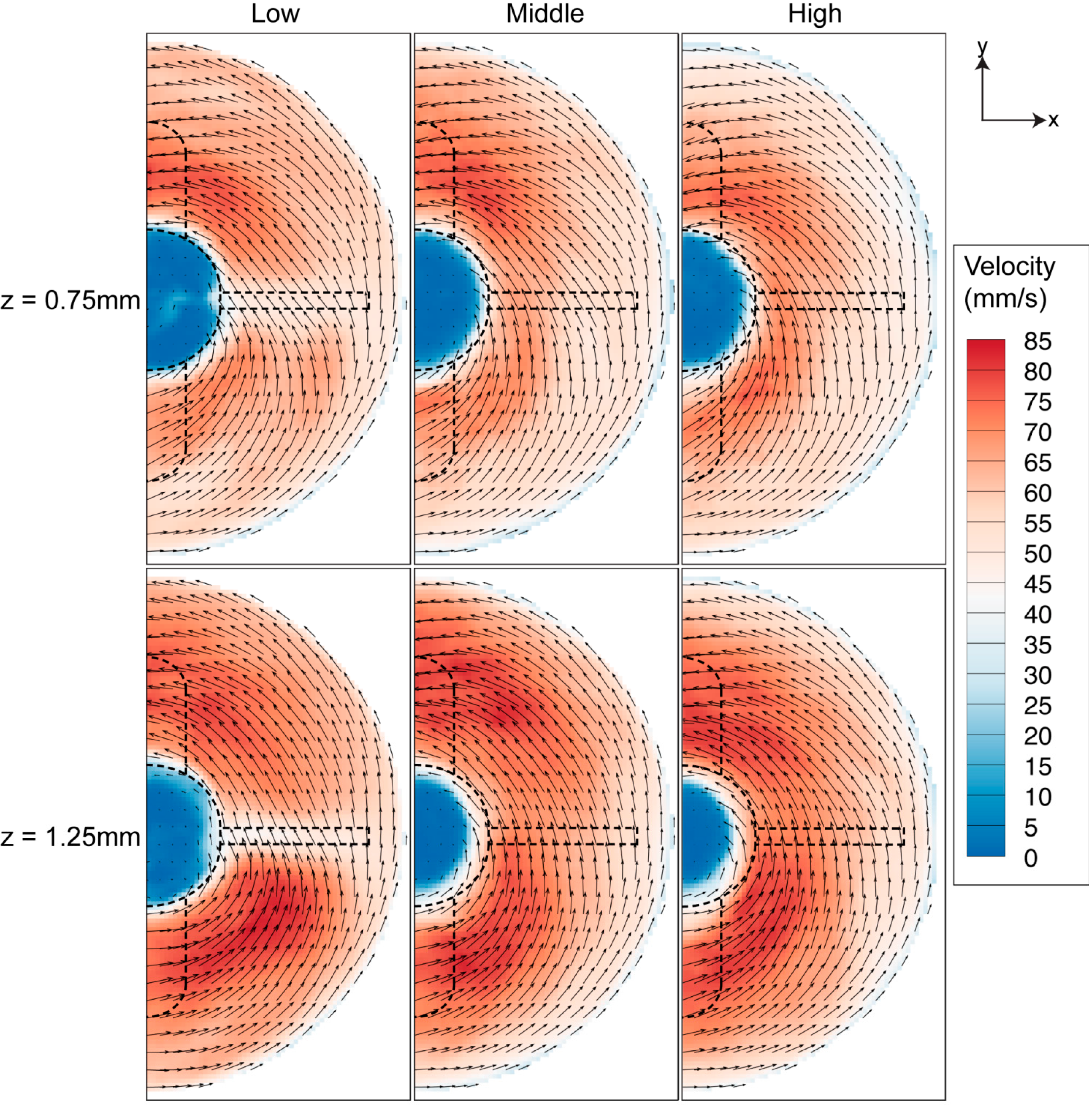 To estimate the shear stress at the bottom wall, two measurements were conducted at z = 0.75 mm and 1.25 mm. The velocity close to the bottom surface was calculated by fitting a parabolic curve to the two velocity profiles, measured at two heights, and the no slip boundary condition at z = 0 mm. Using the estimated velocity, the velocity gradient and shear stress between the fluid in azimuthal plane and end wall was calculated. For the purpose of visualization, only the velocity and shear characteristic for 40 RPM is presented. Because the impeller does not present in the imaging plane for this analysis, the impeller is represented as dashed lines to show the rotation phase in each figure.