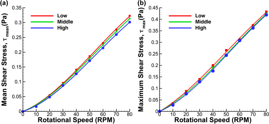 Shear stress plots for three impeller arrangements at varying impeller speed. The (a) mean and (b) maximum shear stresses increase with rotational speed. The magnitude obtained for the low impeller position is higher than for the other impeller locations.