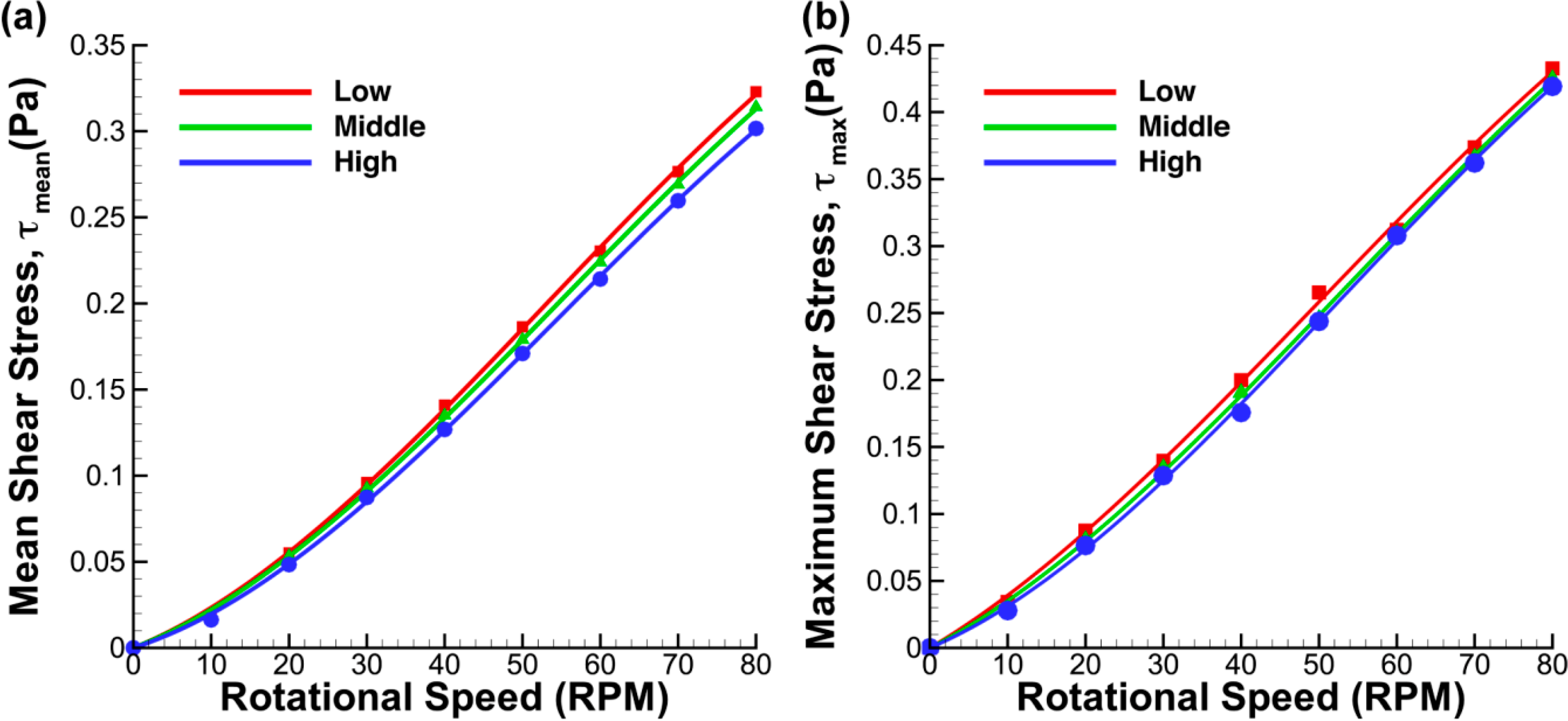 Figure 8 shows the summary of the shear stress determined in the meridional plane for diverse impeller arrangements and speeds. Overall, it can be seen that the average and maximum shear stresses increase with rotational speed. Although the graphs are slightly different to each other at varying impeller positions, the main feature of the graph is maintained at increasing stirring speed, which confirms the consistency of the measurement. All graphs show similarity by having a sudden increase in shear stress at 90 degrees. At this angular position, the fluid achieves its highest velocity when the flat paddle passes the imaging plane. The rapid increase in velocity generates a high shear stress environment in the flask. Our results show that the middle impeller height has marginally higher mean and maximum stress magnitude. Furthermore, there is a significant drop in shear stress for low impeller alignment after the spike at 90 degrees. The observed behaviour results from the different position of vortices generated at varying impeller height that alters the velocity magnitude at the bottom wall. Although the graphs have some minor feature difference, there was not any prominent dissimilarity in terms of the stress distribution in the meridional flow profile for the given impeller locations.