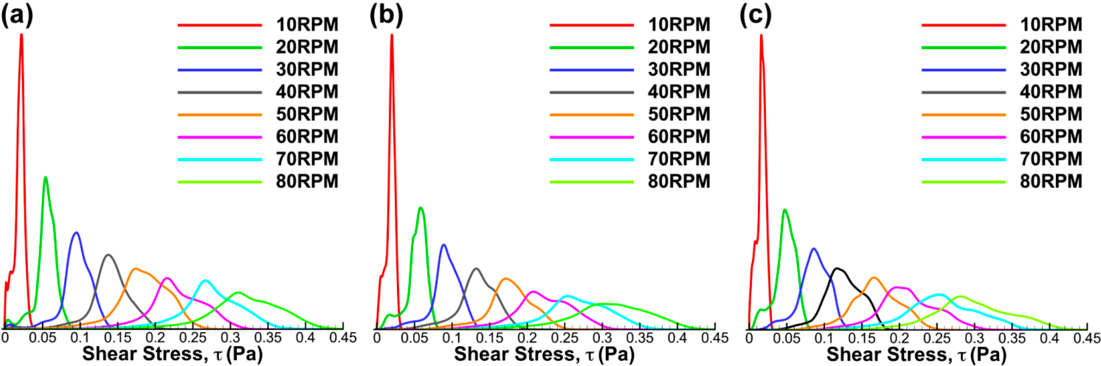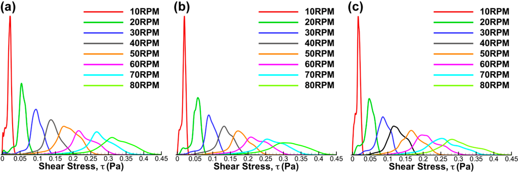 Figure 15 illustrates that the shear stress distribution was also not severely affected by the change in impeller position. However, unlike the shear stress distribution in the meridional plane, the shear stress distribution at the base skewed to higher magnitudes at increasing rotational speed. Due to the fact that the force at the bottom surface was highly dependent on the magnitude of the fluid velocity near the wall, it is not surprising to see that the peak of the distribution shifted to lower value as the impeller was placed at great heights. Microcarriers normally have higher density compared to the working fluid. Thus, they tend to sink and stay at the bottom of the flask. The flow analysis near the bottom wall will enable researchers to quantitatively determine the shear stress that may cause damage to any particular line of cells.