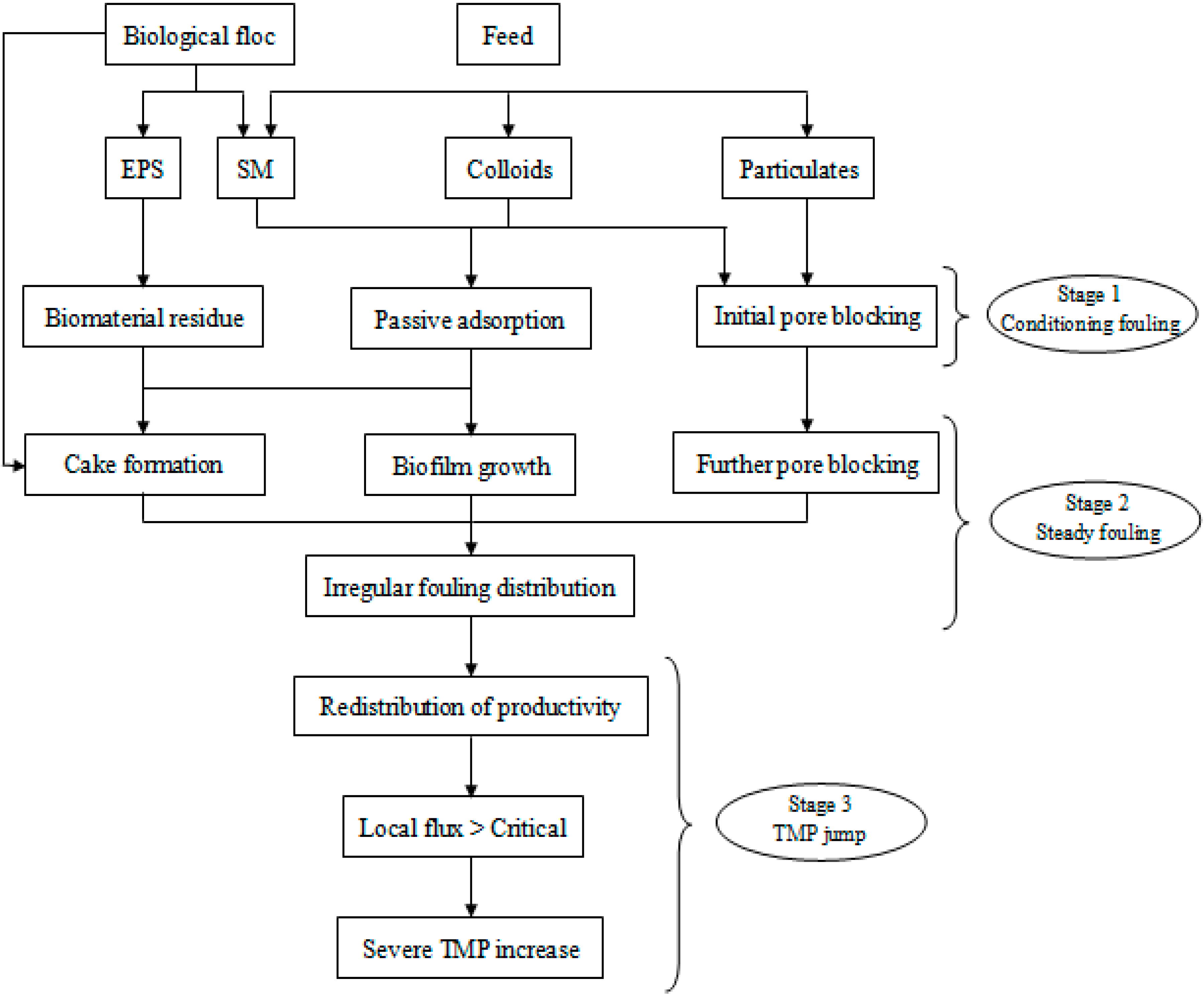 - Critical suction pressure model: The two-stage pattern of a gradual TMP rise followed by a more rapid increase has been observed from studies conducted based on dead-end filtration of a fine colloid by an immersed HF. At a critical suction pressure it is suggested coagulation or collapse occurs at the base of the cake, based on membrane autopsy evaluations supplemented with modeling [114]. A very thin dense layer close to the membrane surface, as observed in the study, would account for the rapid increase in resistance leading to the TMP jump. Although this work was based on dead-end rather than crossflow operation, the mechanism could apply to any membrane system where fouling continues until the critical suction pressure is reached, where-upon the depositing compound(s) coalesce or collapse to produce a more impermeable fouling layer.