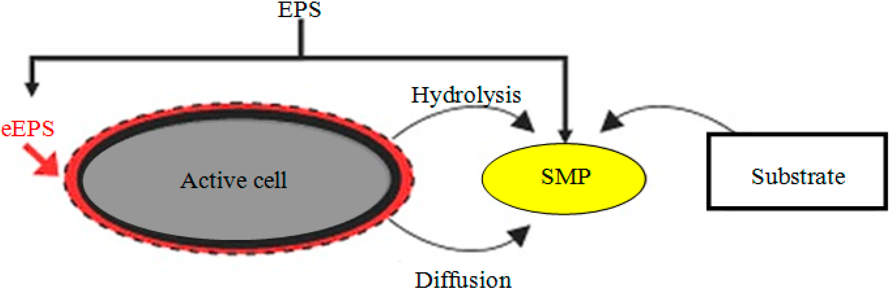 With specific regard to filtration of activated sludge in aerobic MBRs, it is widely recognized that the main foulants are the extracellular polymeric substances (EPS) [4,5,6,7] which constitute a matrix of high molecular weight molecules excreted from cells. Functions of the EPS matrix include aggregation of bacterial cells in flocs and biofilms, formation of a protective barrier around the bacteria, retention of water and adhesion to surfaces [8]. With its heterogeneous and changing nature, EPS can form a highly hydrated gel matrix in which microbial cells are embedded [9] and can thus help create a significant barrier to permeate flow in membrane processes.