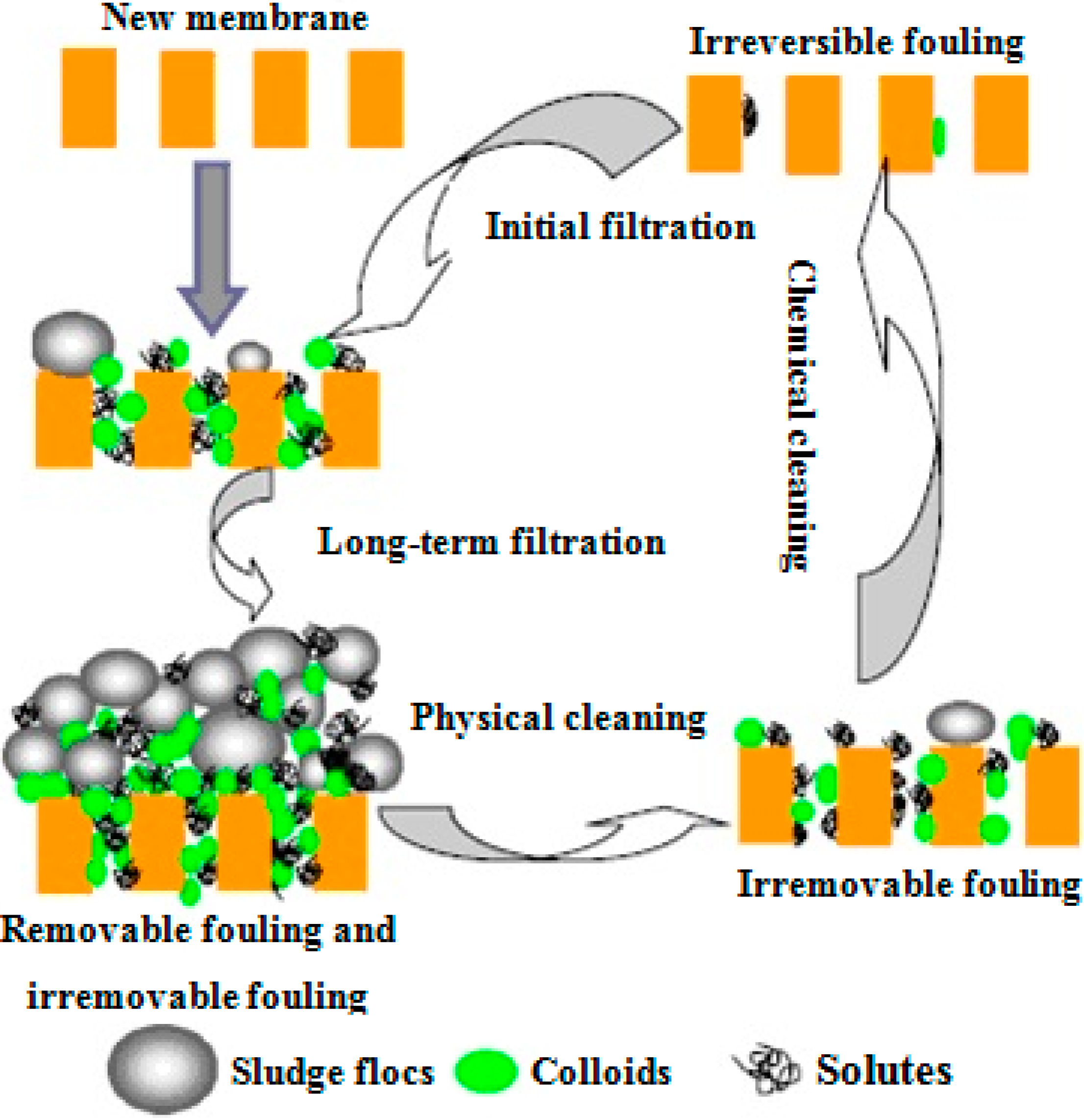 Membrane Bioreactors (MBR) fouling mechanisms for operation at constant flux. Reproduced with permission from Reference [10]. Copyright 2011 Elsevier.