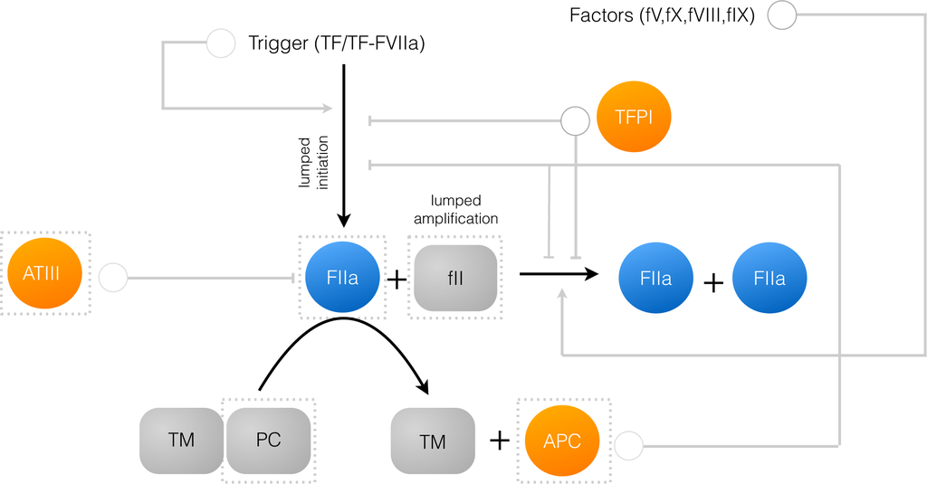 In this study, we developed a hybrid approach which combined ODE modeling with logical rules to model a well studied biochemical network, the human coagulation system. Coagulation is an archetype proteolytic cascade involving both positive and negative feedback [10–12]. Coagulation is mediated by a family proteases in the circulation, called factors and a key group of blood cells, called platelets. The central process in coagulation is the conversion of prothrombin (fII), an inactive coagulation factor, to the master protease thrombin (FIIa). Thrombin generation involves three phases, initiation, amplification and termination [13,14]. Initiation requires a trigger event, for example vessel injury, which leads to the activation of factor VII (FVIIa). Two converging pathways, the extrinsic and intrinsic cascades, then process and amplify this initial coagulation signal. The extrinsic cascade is generally believed to be the main mechanism of thrombinogenesis in the blood [15–17]. Initially, thrombin is produced upon cleavage of prothrombin by fluid phase activated factor X (FXa), which itself has been activated by Tissue Factor/activated factor VII (TF/FVIIa) [10]. Picomolar amounts of thrombin then activate the cofactors factors V and VIII (fV and fVIII) and platelets, leading to the formation of the tenase and prothrombinase complexes on activated platelets. These complexes amplify the early coagulation signal by further activating FXa, and directly converting prothrombin to thrombin. There are several control points in the cascade that inhibit thrombin formation, and eventually terminate thrombin generation. Tissue Factor Pathway Inhibitor (TFPI) inhibits FXa formation catalyzed by TF/FVIIa, while antithrombin III (ATIII) neutralizes several of the proteases generated during coagulation, including thrombin. Thrombin itself also inadvertently plays a role in its own inhibition; thrombin, through interaction with thrombomodulin, protein C and endothelial cell protein C receptor (EPCR), converts protein C to activated protein C (APC) which attenuates the coagulation response by proteolytic cleavage of fV/FVa and fVIII/FVIIIa. Termination occurs after either prothrombin is consumed, or thrombin formation is neutralized by inhibitors such as APC or ATIII.