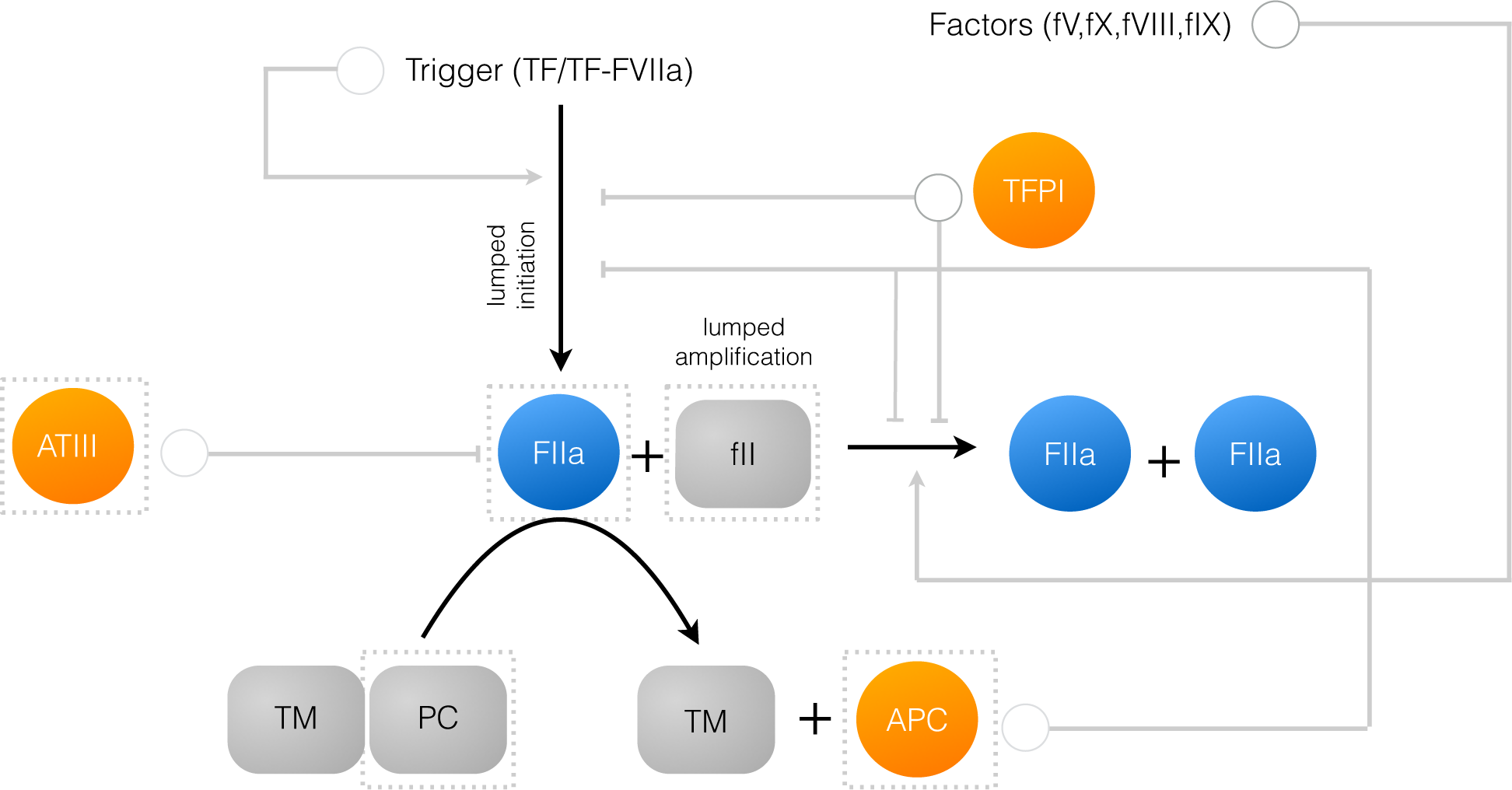 Schematic of the connectivity of the reduced order coagulation model. A trigger compound, e.g., TF/FVIIa initiates thrombin production (FIIa) from prothrombin (fII). Once activated, thrombin catalyzes its own activation (amplification step), as well as its own inhibition via the conversion of protein C to activated protein C (APC). APC and tissue factor pathway inhibitor (TFPI) inhibit initiation and amplification, while antithrombin III (ATIII) directly inhibits thrombin. All inhibition steps and trigger-induced initiation were modeled using a rule-based approach. Likewise, the dependence of amplification on other coagulation factors was also modeled using a rule-based approach. The abundance of the highlighted species (in the dashed boxes) was governed by an ordinary differential equation. All other species were assumed to be constant.