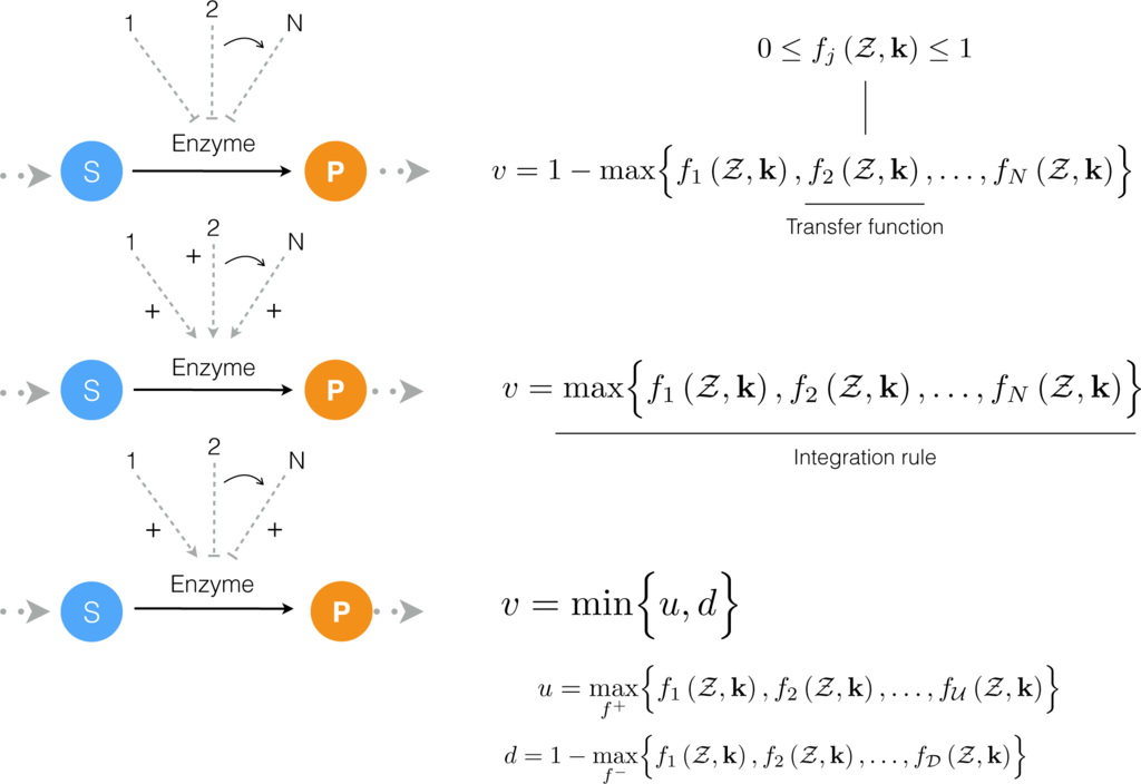. At each simulation time step, the υj variables are calculated by evaluating integration rules such as the max or min of the set of transfer functions f1,…, fn influencing the activity of enzyme Ej.