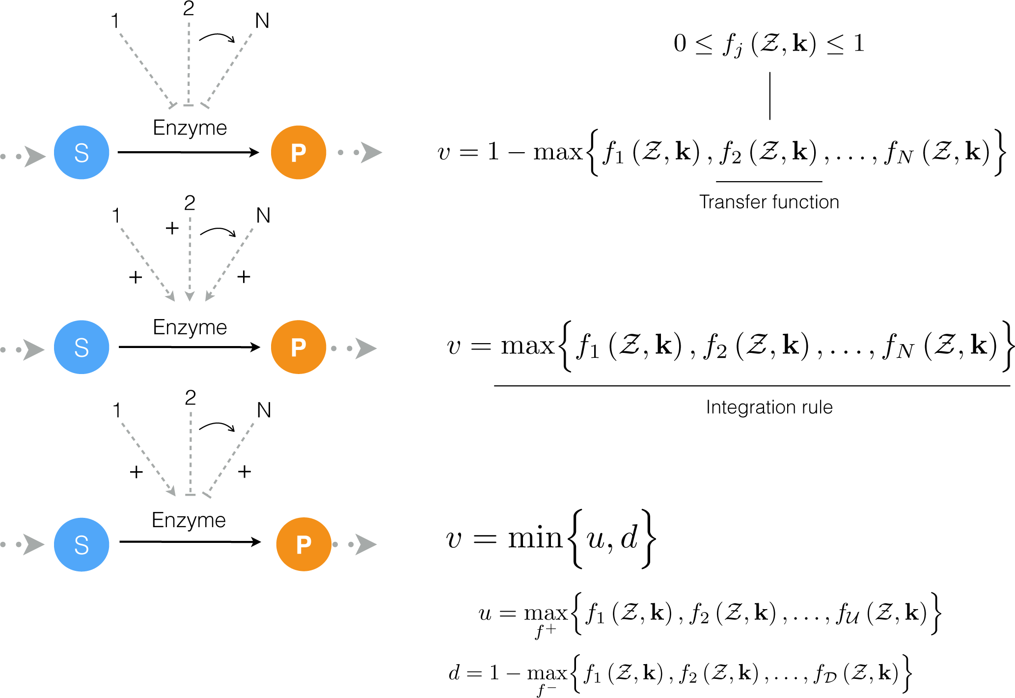 The quantities j+ and j− denoted the sets of activating and inhibitory factors for enzyme j. If a process has no modifying factors, we set vj = 1. There are many possible functional forms for 0 ≤ fij (Z) ≤ 1. However, in this study, each individual regulatory transfer function took the form: