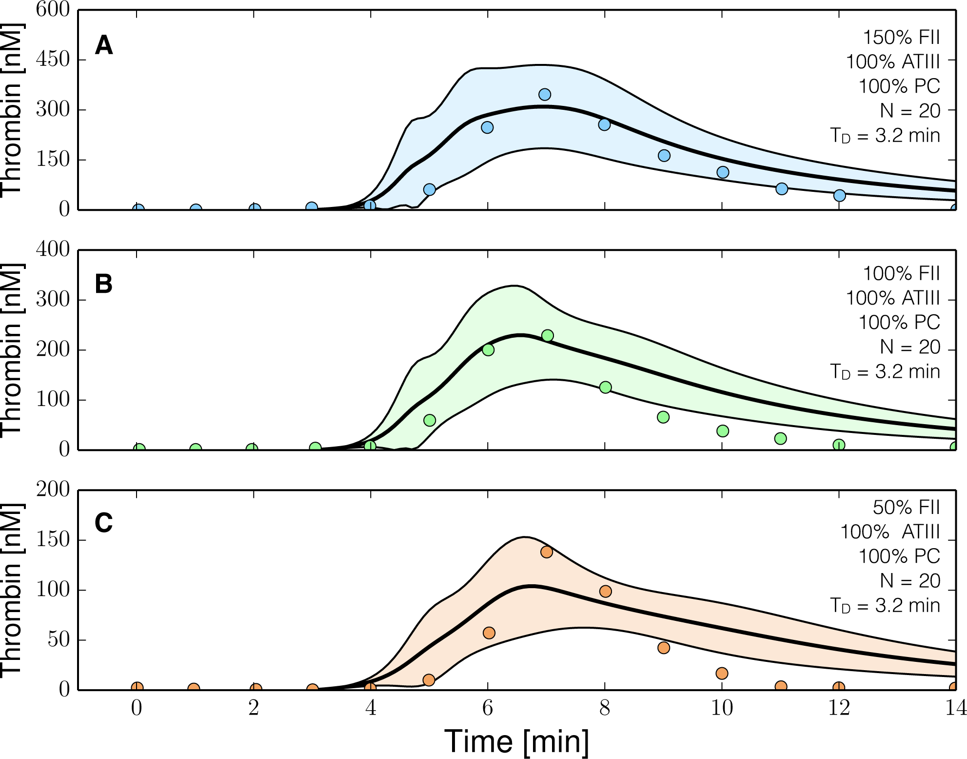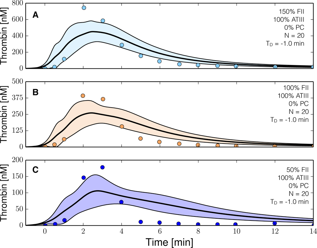 Reduced order coagulation model training simulations. Reduced order coagulation model parameters were estimated using particle swarm optimization (PSO) without the protein C pathway as a function of prothrombin. Solid lines denote the simulated mean value of the thrombin profile for N = 20 independent particles, points denote experimental data. The shaded region denotes the 99% confidence estimate of the mean simulated thrombin value (uncertainty in the model simulation). (A–C) depict training data and results for 150%, 100% and 50% of physiological prothrombin levels in the absence of protein C pathway. The experimental training data was reproduced from the study of Butenas et al. [40]. Thrombin generation in these experiments was initiated using 5 pmol/L FVIIa-TF in the presence of 200 µmol/L of phospholipid vesicles (PCPS). As depicted in (A–C) the prothrombin levels were at 150%, 100% and 50% of their physiological concentration in the absence of protein C pathway. All factors and control proteins in these experiments were at their physiological concentration unless otherwise denoted.