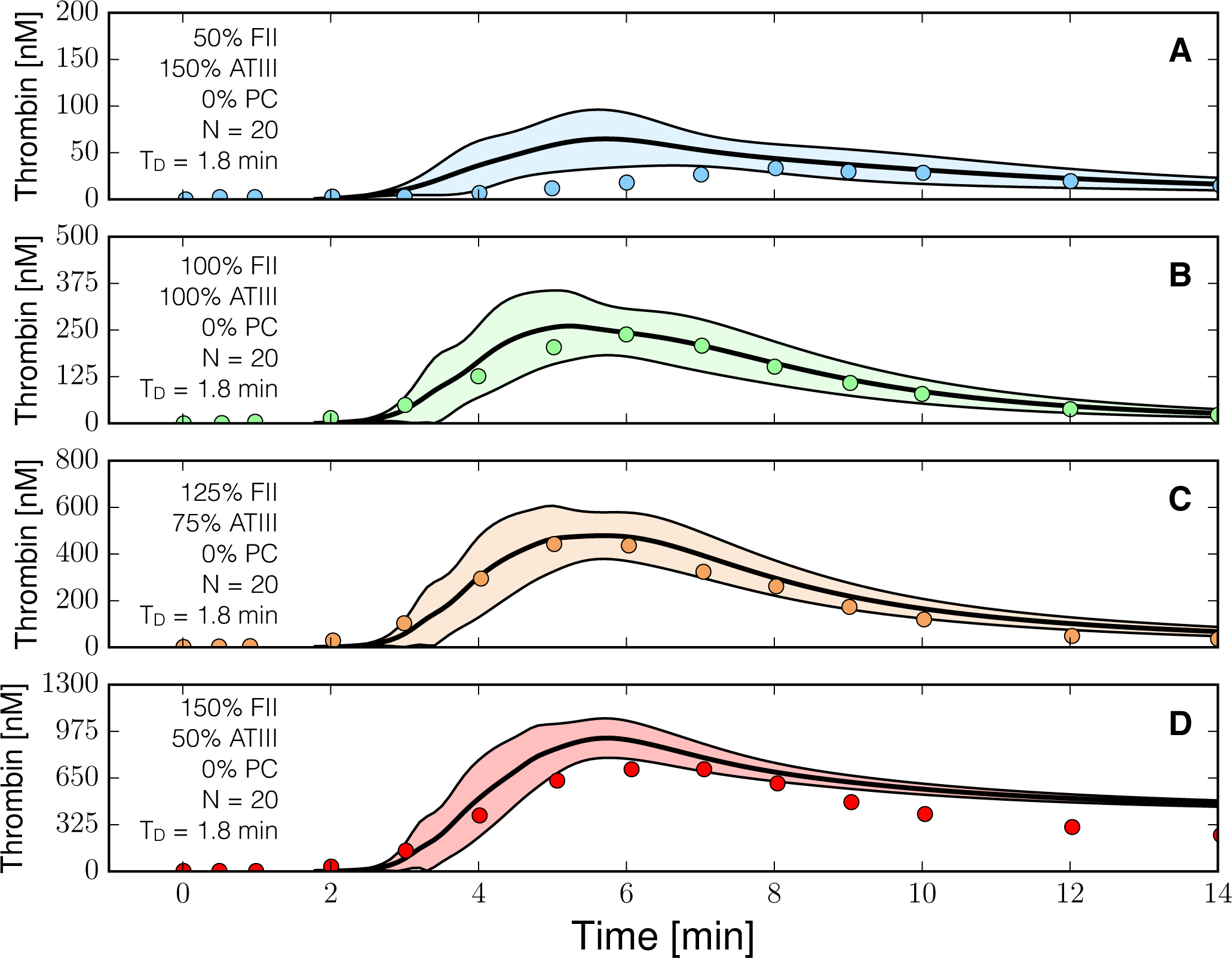 Reduced order coagulation model predictions versus experimental data for normal coagulation. The reduced order coagulation model parameter estimates were tested against data not used during model training. Simulations of different levels of prothrombin and ATIII were compared with experimental data in the absence of the protein C pathway. Solid lines denote the simulated mean value of the thrombin profile for N = 20 independent particles, points denote experimental data. The shaded region denotes the 99% confidence estimate of the mean simulated thrombin value (uncertainty in the model simulation). (A–D) prediction results for (FII,ATIII): (50%, 150%), (100%, 100%), (125%, 75%) and (150%,50%) of physiological prothrombin and ATIII levels in the absence of the protein C pathway. The experimental validation data was reproduced from the study of Butenas et al. [40]. Thrombin generation in these experiments was initiated using 5 pmol/L FVIIa-TF in the presence of 200 µmol/L of phospholipid vesicles (PCPS). As depicted in (A–D) the prothrombin and ATIII levels were at (50%, 150%), (100%, 100%), (125%, 75%) and (150%, 50%) of their physiological concentrations in the absence of protein C pathway. All factors and control proteins were at their physiological concentration unless otherswise denoted.