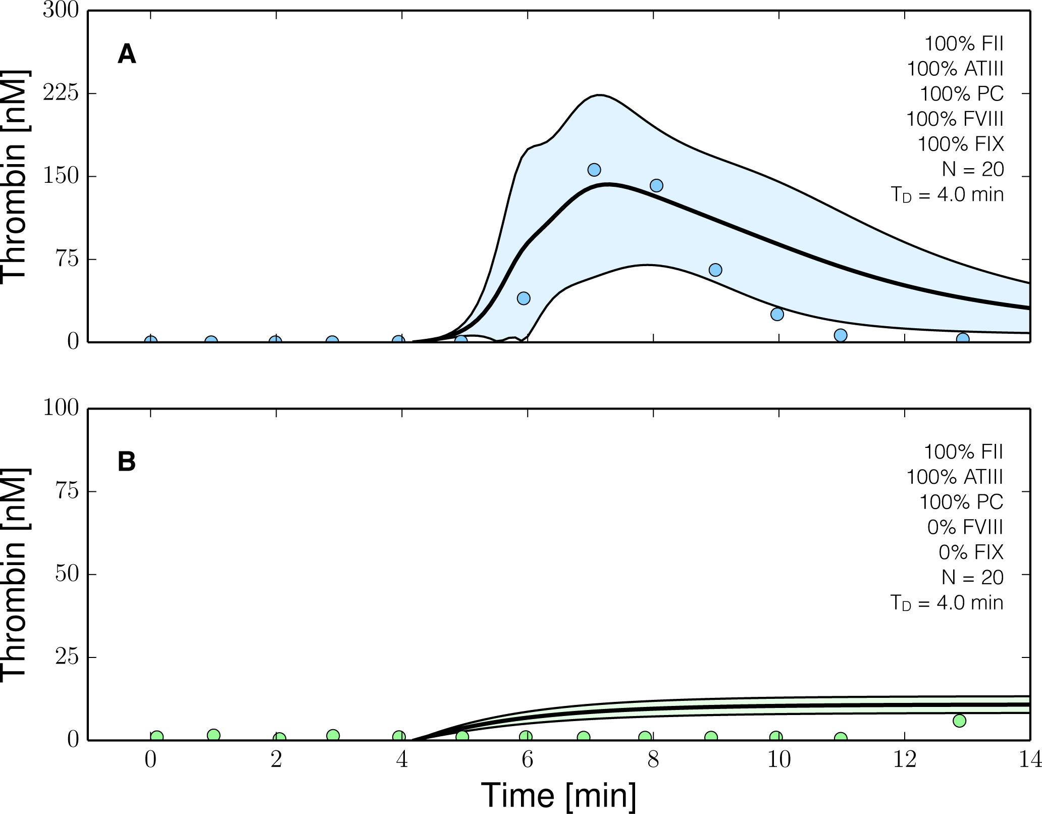Reduced order coagulation model predictions versus experimental data with and without coagulation factors VIII (fVIII) and IX (FIX). The reduced order coagulation model parameter estimates were tested against data not used during model training. Simulations of normal thrombin formation with ATIII and the protein C pathway were compared with thrombin formation in the absence of fVIII and fIX. Solid lines denote the simulated mean value of the thrombin profile for N = 20 independent particles, points denote experimental data. The shaded region denotes the 99% confidence estimate of the mean simulated thrombin value (uncertainty in the model simulation). (A,B) prediction results for normal thrombin generation and thrombin generation in hemophilia. All factors and control proteins were at their physiological concentration unless others noted. Coagulation was initiated with 0.2 nmol/L FVIIa. The experimental validation data was reproduced from the study of Allen et al. [42].
