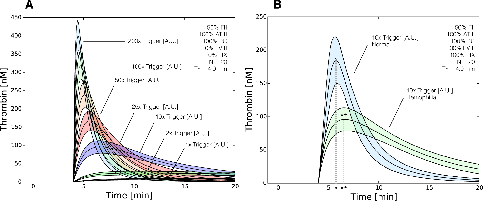 Reduced order coagulation model predictions of rFVIIa administration. (A) Simulations of thrombin formation in the presence of ATIII and the protein C pathway were conducted for a range of trigger values (1x–200x nominal) in the absence of fVIII and fIX; (B) Comparison of thrombin generation for normal versus hemophilia for 10x nominal trigger. Solid lines denote the simulated mean value of the thrombin profile for N = 20 independent particles. The peak thrombin time for normal coagulation (t∗) is less than rFVIIa induced coagulation in hemophilia (t∗∗), while the peak thrombin value was greater in normal coagulation. The shaded region denotes the 99% confidence estimate of the mean thrombin value (uncertainty in the model simulation). All factors and control proteins were at their physiological concentration unless others noted.