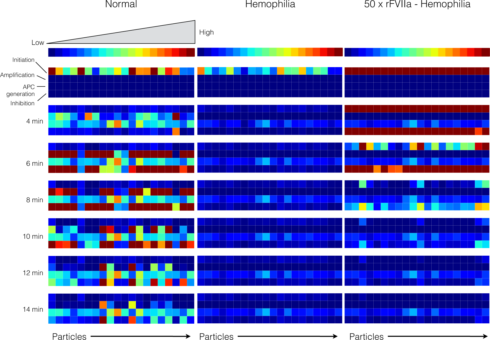 Reaction flux distribution as a function of time for thrombin generation under normal (left), hemophilia (center) and rFVIIa treated hemophilia (right). Reaction flux was calculated for each particle at T = 0, 4, 6, 8, 10, 12, 14 min after the initiation of coagulation. Reaction fluxes were calculated for each particle in the parameter ensemble (N = 20). Blue colors denote low flux values while red colors denote high flux values.