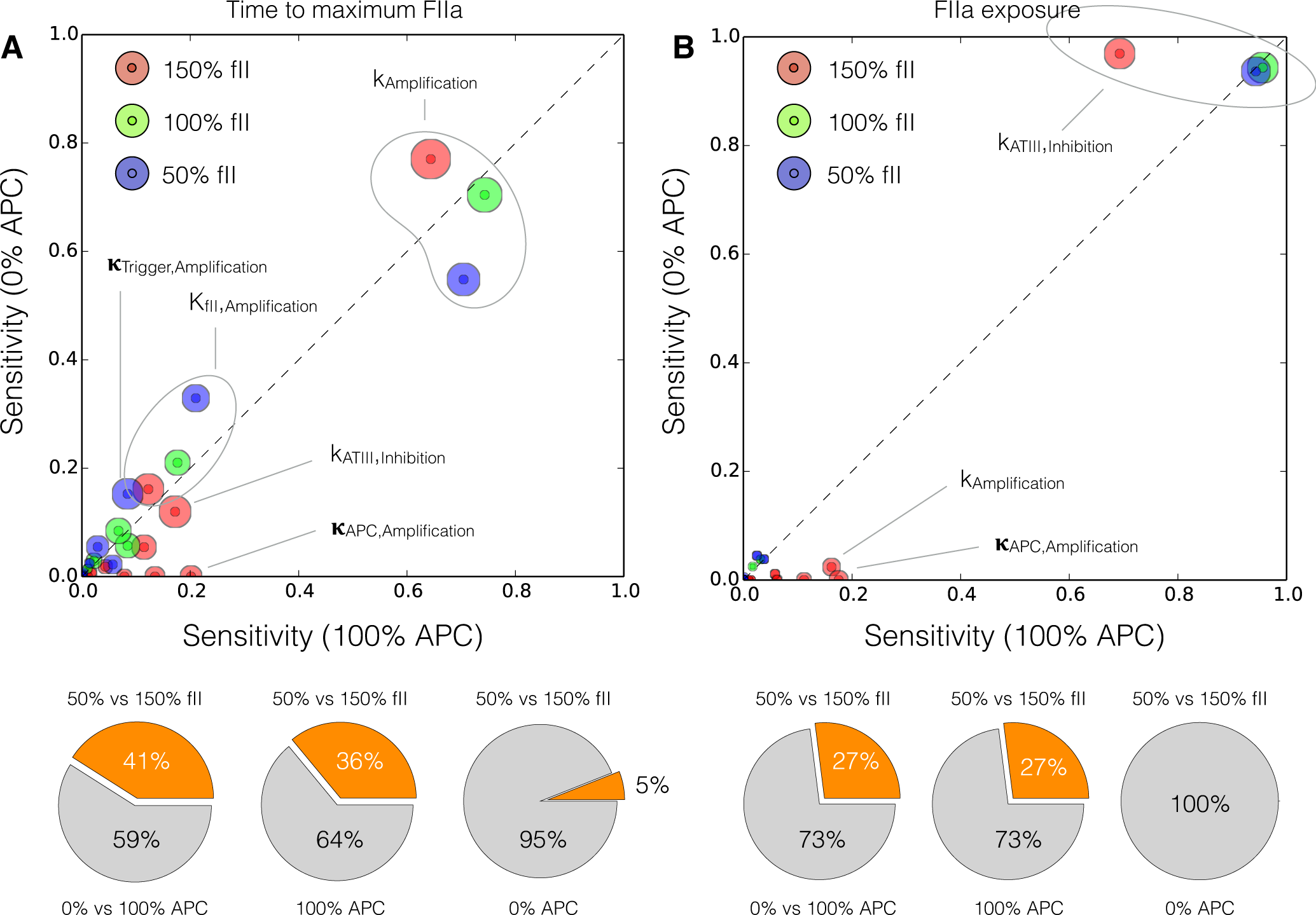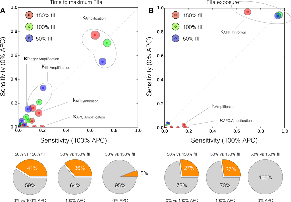 Global sensitivity analysis of the reduced order coagulation model with respect to the model parameters. (A) Sensitivity analysis of the thrombin peak time for different prothrombin levels (150%, 100% and 50% of the physiological value) as a function of activated protein C; (B) Sensitivity analysis of the thrombin exposure for different prothrombin levels (150%, 100% and 50% of the physiological value) as a function of activated protein C. Points denote the mean total sensitivity value, while the area around each point denotes the uncertainty in the sensitivity value. The gray dashed line denotes the 45° degree diagonal, if sensitivity values are equal for different conditions they will lie on the diagonal. Sensitivity values significantly above or below the diagonal indicate differentially important model parameters. The radius of the shaded region around each total sensitivity value was the maximum uncertainty in that value estimated by the Sobol method.