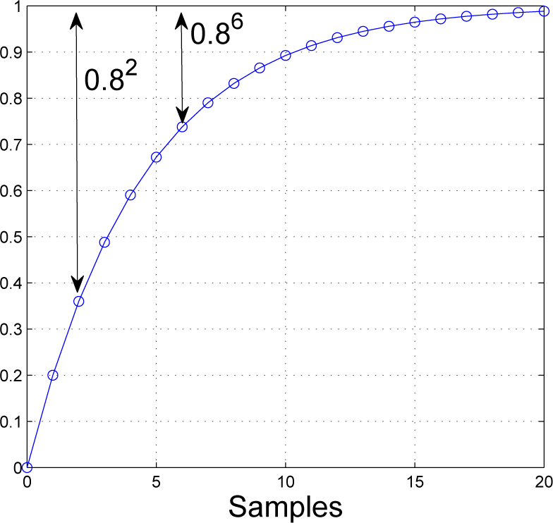 where rtr(s) represents the continuous time or Laplace representation and rtr(z) the discrete time or z-transform representation; R is taken to be the actual steady-state target. A typical desired step response, with no delay, is plotted in Figure 1, where, here, the discrete pole is set at ρ = 0.8.