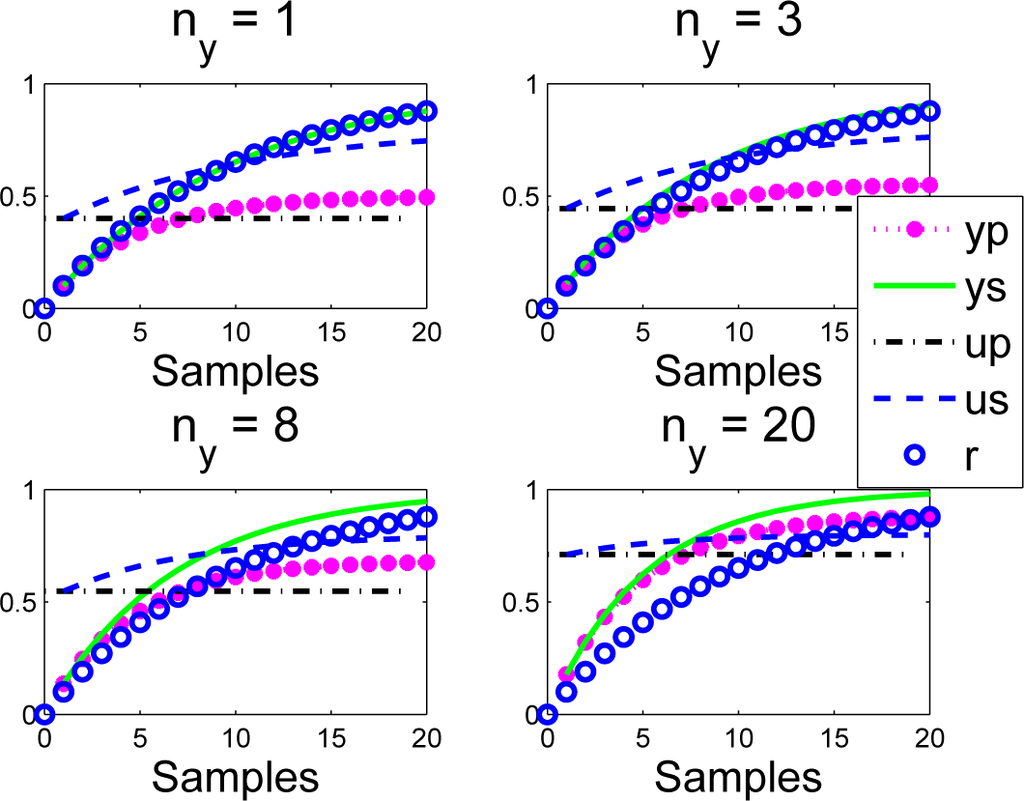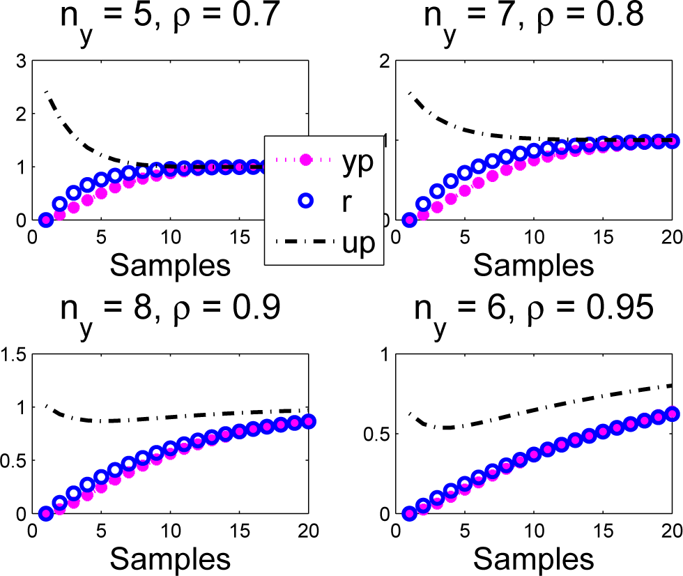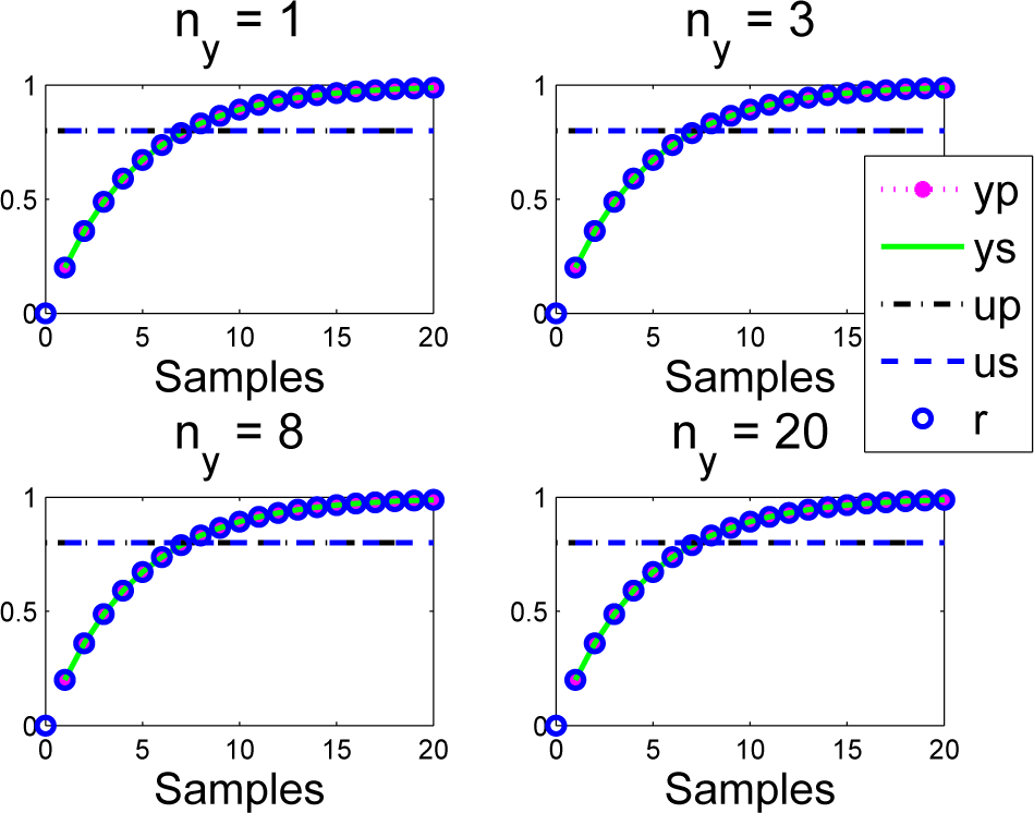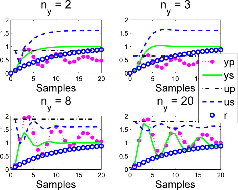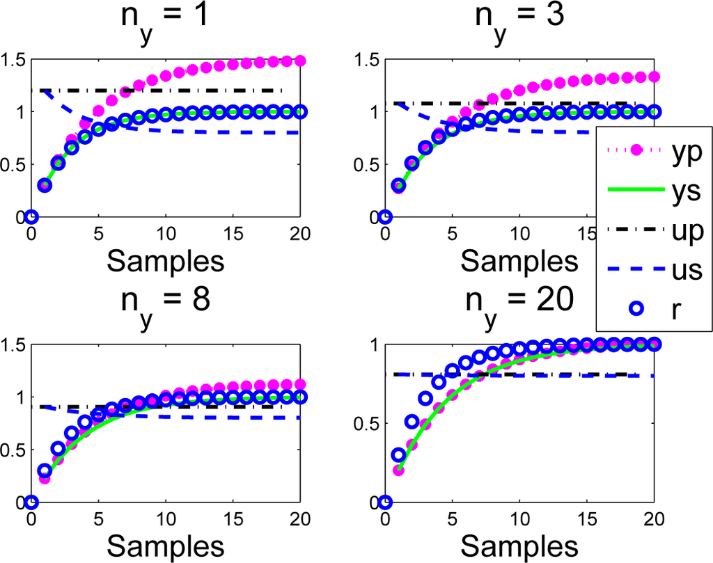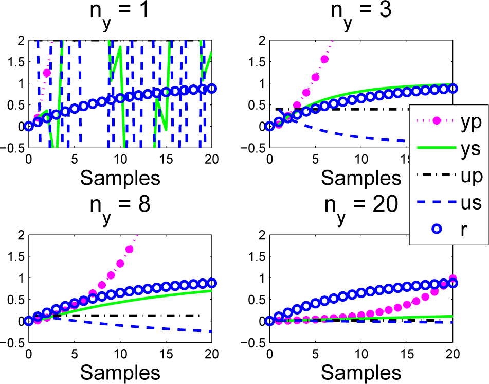 - As ny increases, the choice of ρ becomes less and less significant (the output yp does not track the target r), but there is much better consistency between predictions yp and behaviour ys.