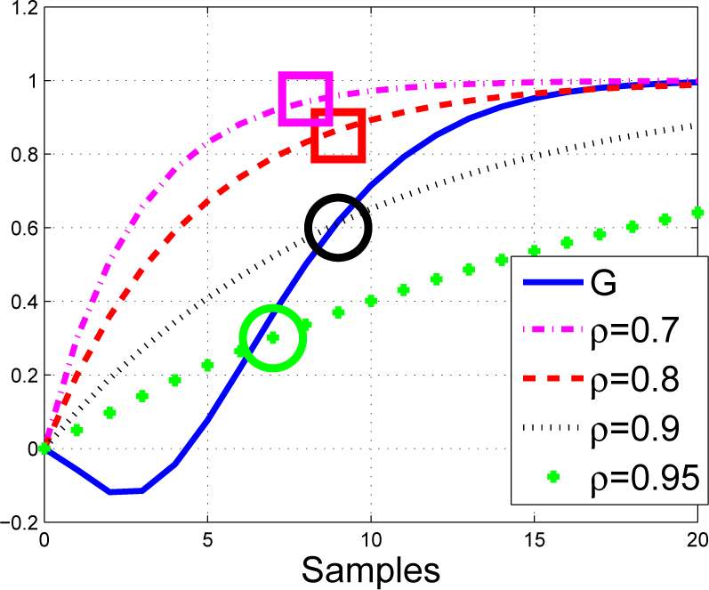 - It is clear that for ρ = 0:9, an intercept exists between the step response and target, and hence, ny = 8 would be a logical choice of coincidence point.