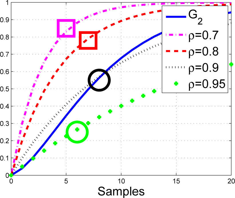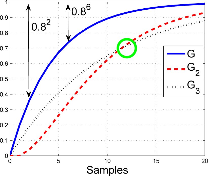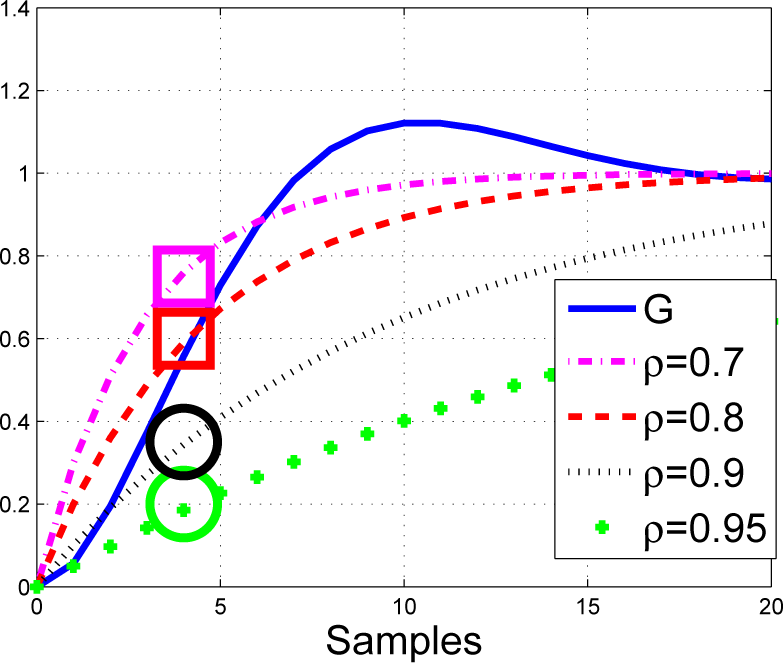 From this observation, it is rather obvious that using a coincidence horizon of one for higher order systems makes no sense at all, and indeed, one may need to target a much slower implied first order pole, such as G3, along with a higher coincidence horizon (ny = 12 is marked in this figure) to get sensible answers! Indeed, it can be shown that using ny = 1 can imply a controller using “plant inversion”, which is not robust.