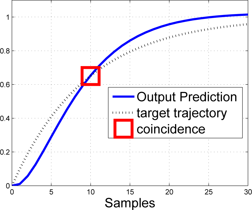 For step targets, PFC chooses a single sample instant in the future, the so-called coincidence horizon ny, and ensures that the actual output prediction matches the target response at that point only. Consequently, the PFC control law reduces to (conceptually), enforcing the equality: