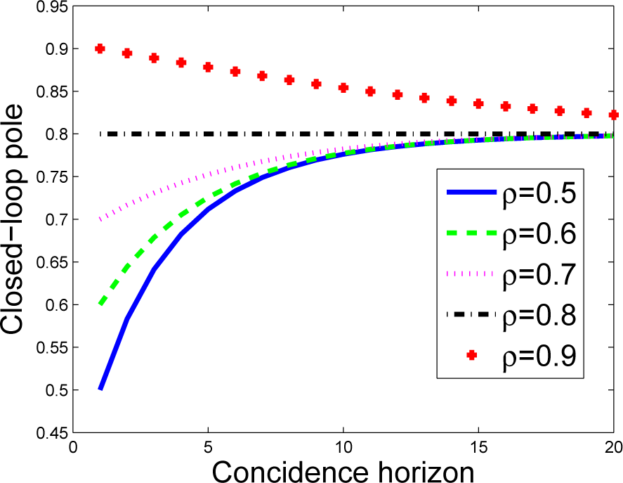 Corollary 1. The coincidence horizon and parameter ρ only have a noticeable impact on the control law if the coincidence horizon is small. Irrespective of the choice of ρ, the closed-loop pole tends to a as the coincidence horizon tends to infinity. This is a natural consequence of Equation (10), because: