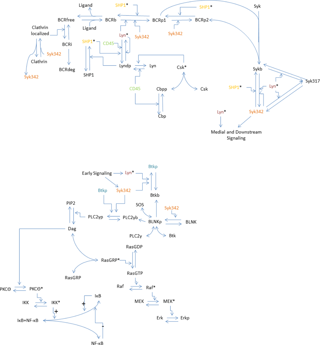Computational modeling allows us to gain insight into Syk’s impact that was not previously possible with experimentation alone. We have developed a model built on a T cell receptor (TCR) signaling model originally created by Zheng et al. [2] and later expanded and used by Perley et al. [3] for cellular level control. Perley’s success in using Zheng’s model for prediction and open-loop control made it an ideal candidate to adapt for our B cell study. The signaling of B cell and of T cell can be divided into early interactions, which occur proximal to the membrane, and downstream interactions, which occur in the cytoplasm and ultimately lead to the nucleus. The dynamics of the downstream signaling are nearly identical between the cells, and thus this part of the Zheng model remained largely unchanged. The signaling dynamics of T cell and of B cell differ the most in their early signaling, which is where most model revisions were required.