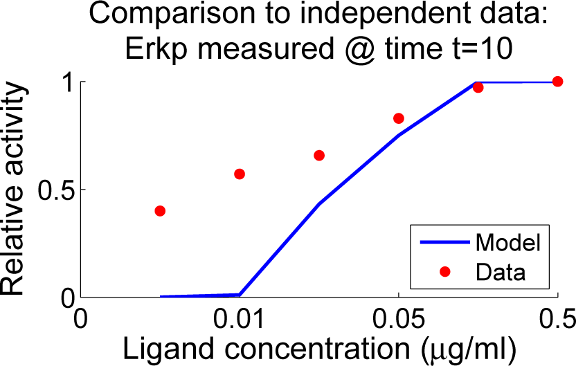 We compared the model to an independent dataset from Chaudhri et al. [6]. These data were not used in screening the parameters; the comparison is presented in Figure 10. The Chaudhri data include ligand concentrations that are much smaller than those available in our training data and indicate a relatively large activation even at very small ligand concentrations. Our model displays significantly smaller activity levels than those seen in the Chaudhri data at these low ligand concentrations. We believe that further parameter screening could produce better agreement to these data, but the underlying question is somewhat deeper in view of the phenomenon of anergy, in which B cells display reduced response to higher levels of ligand concentration. Experiments have shown that a low constant signal [15] can drive a B cell to become anergic and thus relatively unresponsive to the presence of antigen. Hence the question is not only what is the effective level of phosphorylation of Erk at low doses of ligand but also what is the effect of such low doses over extended periods of time. This is consistent with our model predictions of relatively high levels of Erkp activity and low levels of NF-κB activity in response to small amounts of active Syk. However, our model also suggests that the details of forward and reverse binding rates may also play a role in anergy.