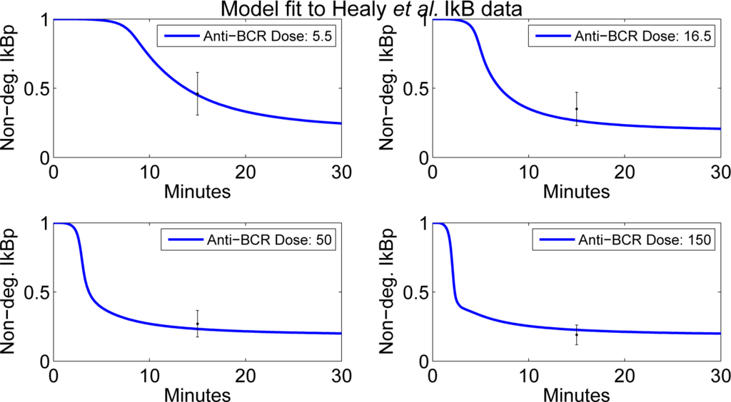 compared with IκB data from Healy et al. [8]. Simulations for non-degraded IκB (normalized by total IκB) are shown (left to right, top to bottom) for 5.5, 16.5, 50 and 150 µg/mL anti-BCR, with all measurements taken at time t = 15 and one standard deviation interval of uncertainty.