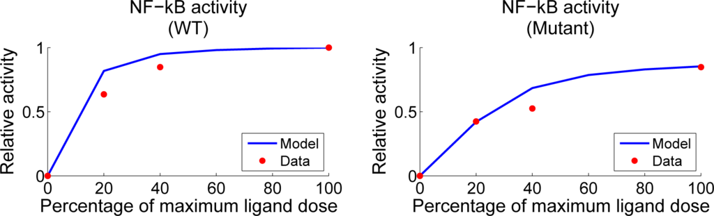 (normalized by WT activity at the maximum dose) is shown to qualitatively agree with the wild-type NF-κB data (•). On the right, a simulation with the parameter vector