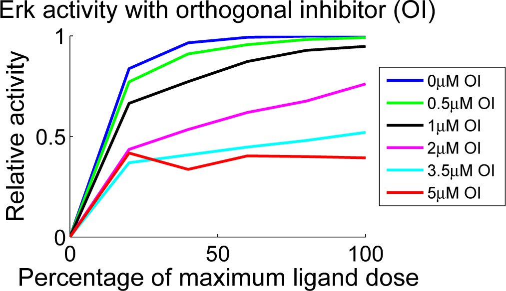 as a function of ligand dose, one curve for each of several doses of orthogonal inhibitor (the OI doses are specified in µM in the legend). The simulation values are given at t = 5 minutes. To investigate the qualitative response, we express the ligand dose in each case as a percentage of saturating dose. As seen in Figure 6, our model exhibits a clear dose response to antigen. Additionally, it is clear in the figure that the orthogonal inhibitor limits the Erkp response; activity level is reduced as the amount of inhibitor increases, suggesting that active Syk is critical to propagate the signal and may be a limiting quantity.