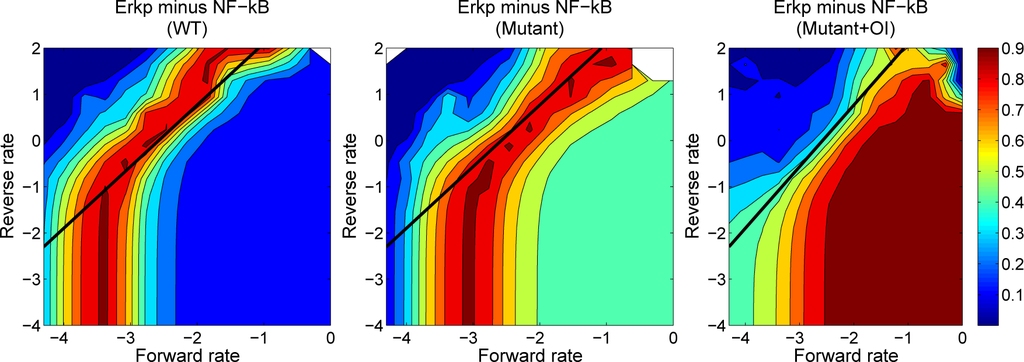 Contour plots for wild-type (WT), mutant without orthogonal inhibitor and mutant with 1 µM orthogonal inhibitor. The diagonal black line has a slope equal to 4/3. Regions with high values correspond to large Erkp response and small NF-κB response (both responses normalized by their maximum WT activity), and hence possible regions of anergy. Both rates are shown in log scale.
