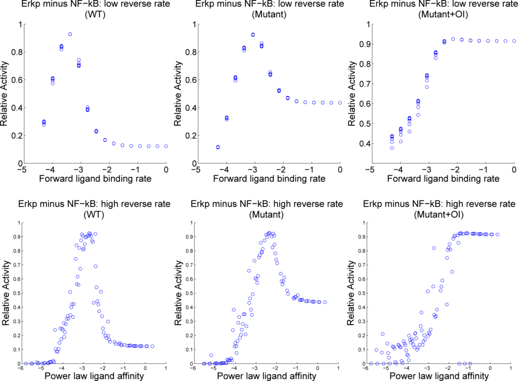 In order to investigate the dependence of Erk and NF-κB activation on ligand–receptor binding rates, we simulated the model at a dose of 20 µg/mL anti-BCR over a product grid of forward and reverse binding rates. This was done for each of wild-type, mutant with no orthogonal inhibitor, and mutant with a dose of 1 µM orthogonal inhibitor. The parameter grid was constructed using evenly spaced points in log scale over ranges for forward and reverse binding rates found in literature [4,6].