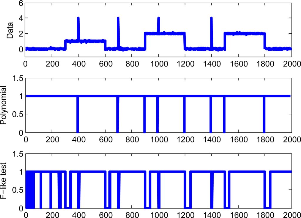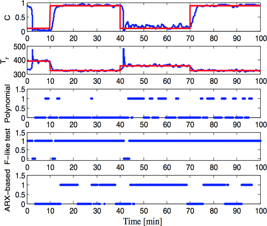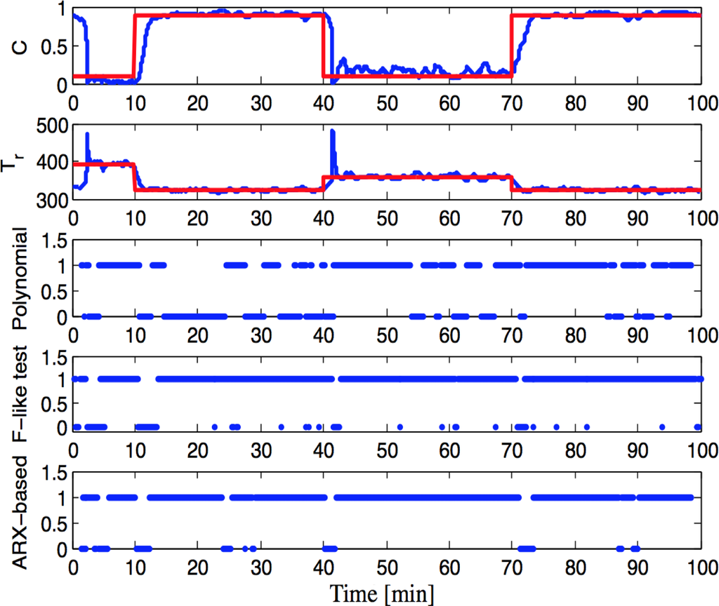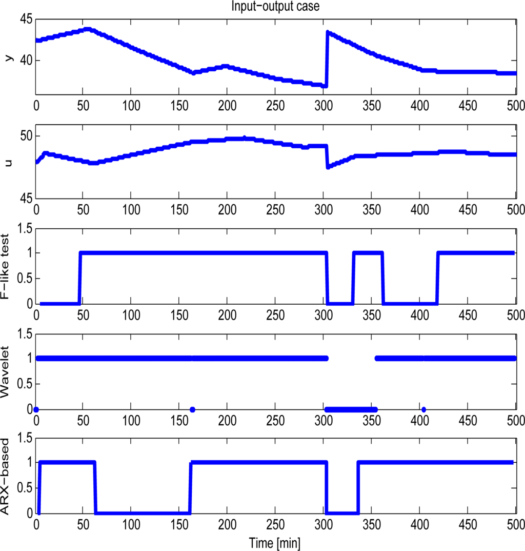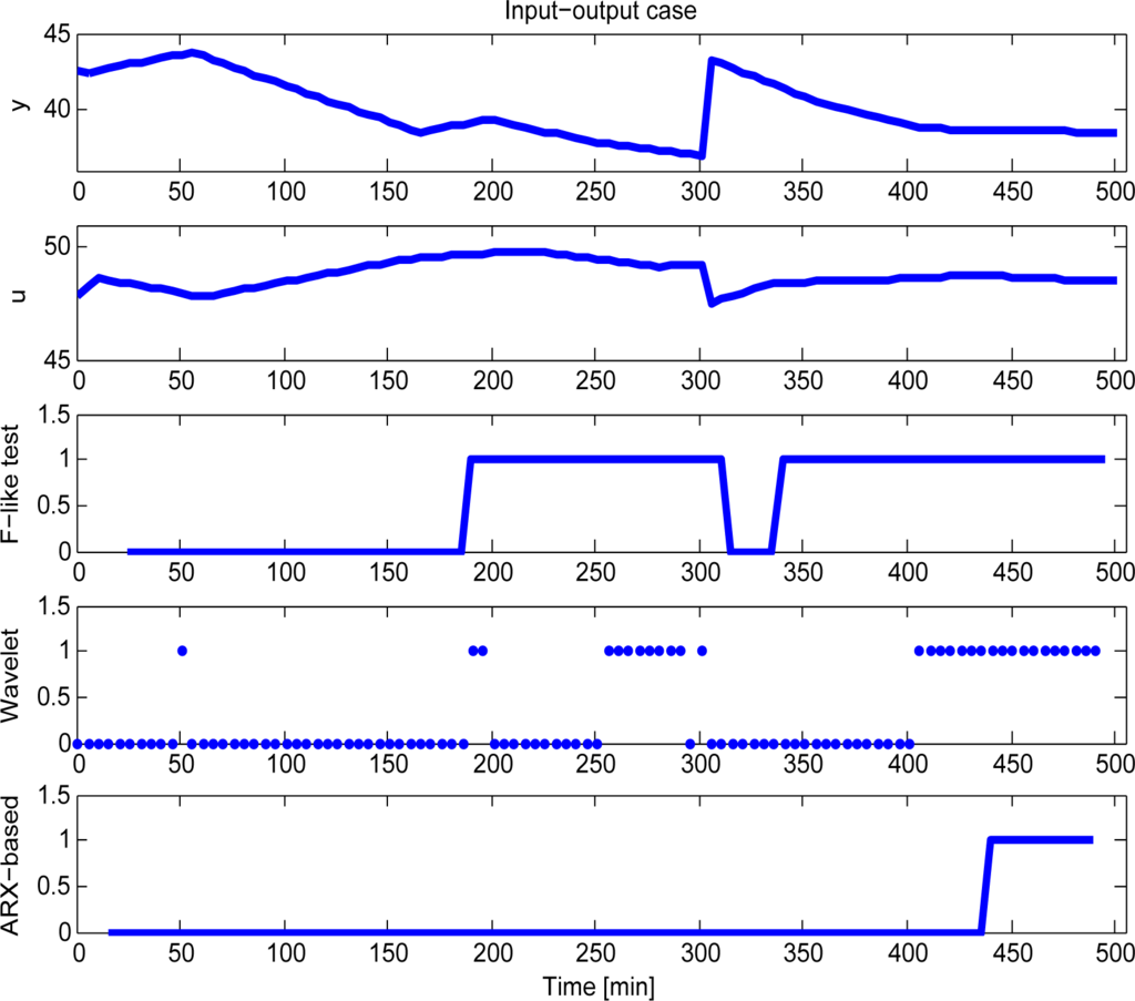The simulated dataset is addressed with the F-like test, polynomial and wavelet techniques. This dataset provides a simple scenario for evaluation of these methods. In this case, our proposed ARX-based approach is not considered due to the absence of process inputs in this dataset. For both cases involving the simulated datasets, the initial simulations with the polynomial technique using the original index defined by Equation 10 did not produce a satisfactory performance. Due to this lack of performance, the polynomial technique index was changed to