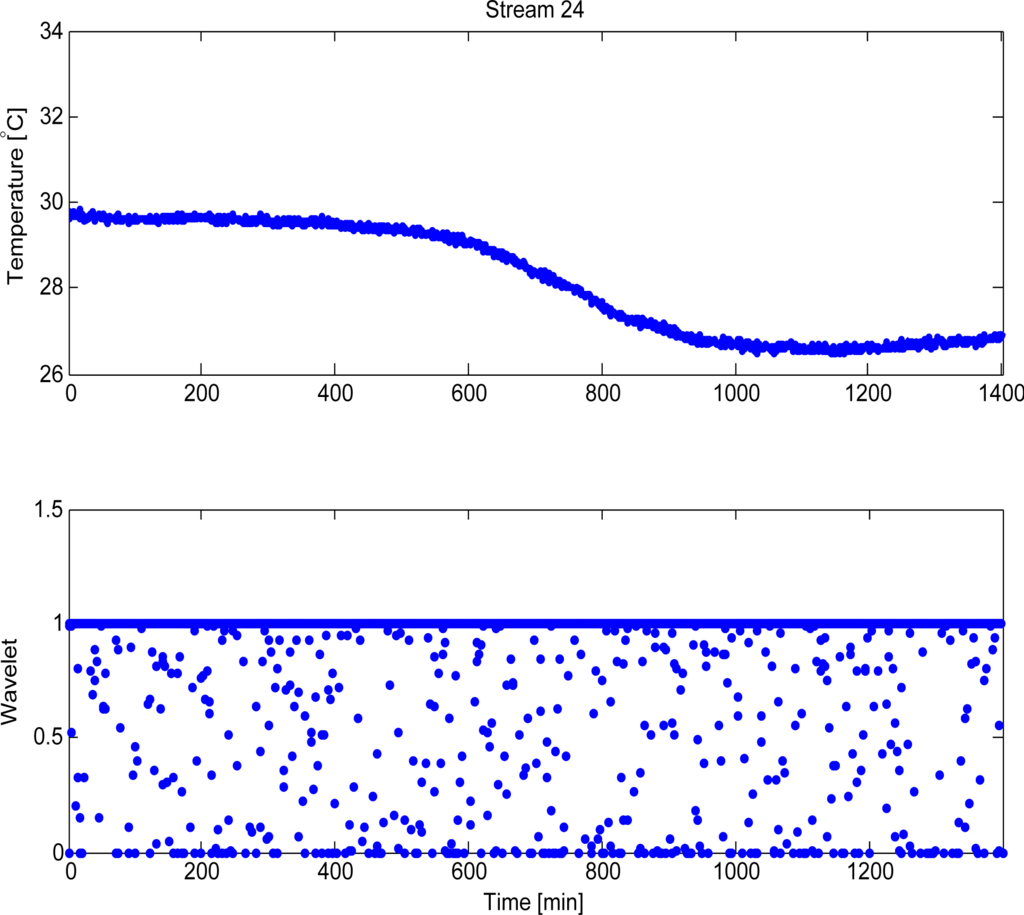 The second portion of the temperature data in Figure 6 corresponding to a different time period is now considered (between test Day 06 at 3:34:00 p.m. until day 09 at 07:53:00 a.m.). These data depicted in the top part of Figure 15 present a different challenge for the methods, as stable periods occur from about 0–600 min and 1,200–1,700 min, with a transient behavior in the rest of the data. Figures 15 and 16 show the results of SSI of this dataset using the output-based methods. Note in Figure 15 that the polynomial technique identified some steady-state points before 600 min, but it missed detecting whole periods, for example the transient one from 2,000–2,500 min. The F-like test obtained a much better result using the last tuning parameters mentioned. As it is possible to observe in the lower part of Figure 15, the F-like test correctly pointed out most of the steady-state period before 600 min. After that point, it obtained satisfactory performance given the dataset variability, except for the part between 1,400 and 1,600 min. The results of the wavelet method with a new λ = 0.1 (used for enhanced performance) are presented in Figure 16 in which the stable periods were efficiently identified before 600 min and from 1,200–1,700 min. This method once again shows improved performance when compared to the other output-based counterparts, with only minor errors for some scattered points before 1,200 min and in the final period of transient behavior from 2,000–2,500 min.