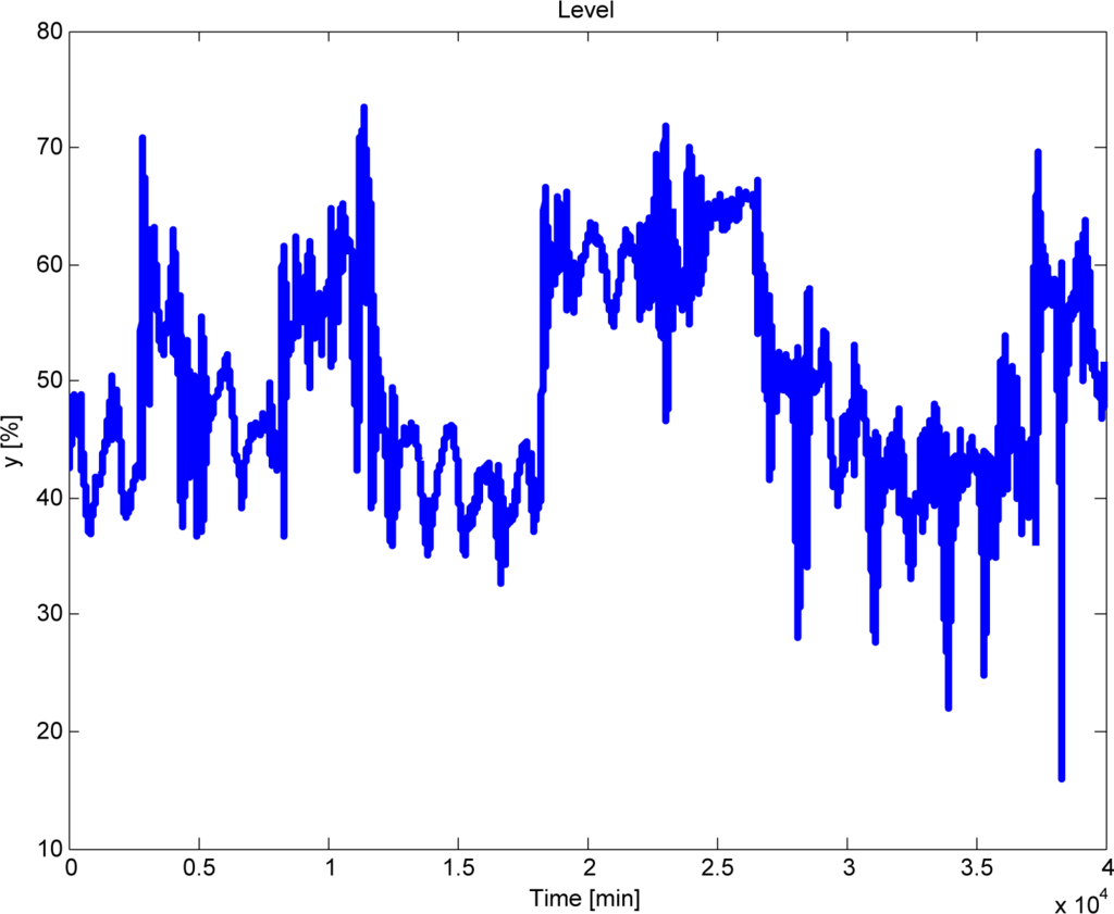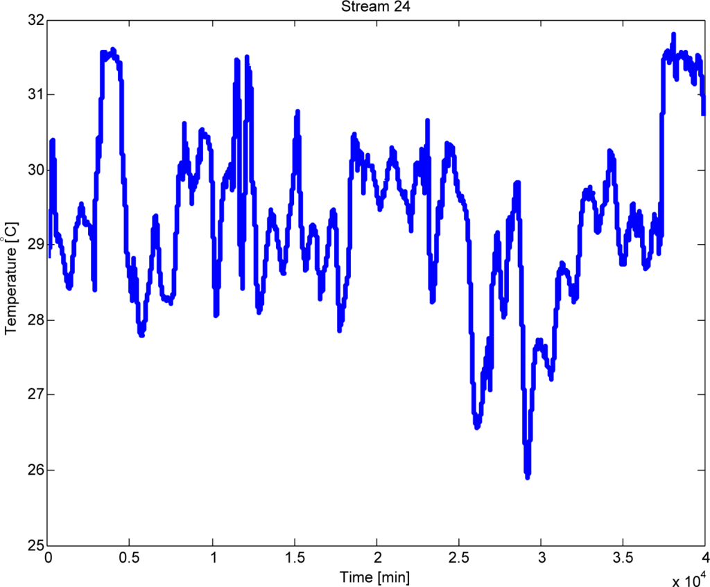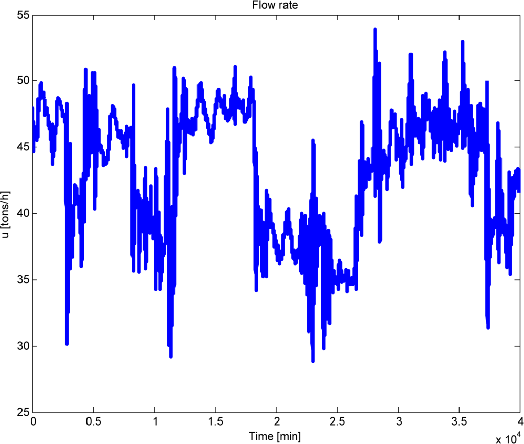 The process model that describes this unit is highly nonlinear, and the pieces of equipment are highly interconnected, as observed in the above description. Furthermore, the detailed version of the model of this process is composed by ≈9,338 variables and represented by differential and algebraic equations. This process is under study for the implementation of a real-time optimization framework based on an equation-oriented simulation environment. For this reason, the identification of the steady states is essential as motivated above. Due to the high-dimensionality characteristics of the original system, we analyze here the SSI involving individual pieces of equipment, namely the reflux drum (TA1) of the column and the heat exchanger (HX4), for simplification purposes. A full-scale SSI problem would be tackled by using the product operator of the SSI results for each variable [3], i.e., if only one variable is not at steady state, the process is considered in transient condition. In this analysis, real process data are considered for the studies. Figure 6 depicts the temperature experimental data for an entire month period of the TA1 outlet Stream 24, which corresponds to an output dataset. Furthermore, Figures 7 and 8 show the level (controlled variable) and flow rate (manipulated variable) of the heat exchanger (HX4) for a month of operation, which is an input-output dataset. To address these cases, first the polynomial, wavelet and the F-like test are implemented for the reflux drum dataset. Then, the selected output-based methods, as well as the proposed ARX-based approach are evaluated for the heat exchanger input-output data.