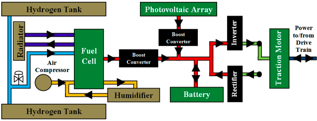 Schematic diagram of the UD fuel cell bus’s PV/PEM fuel cell/NiCd battery hybrid power train. Color legends: (1) Blocks: green, primary components; beige, auxiliary fuel cell components; black, power conditioning units; and (2) Streams: purple, glycol/water mixture; light blue, hydrogen; yellow, air; red, DC power; light green, AC power; dark blue, mechanical power to/from the drive train. Black arrows indicate stream flow direction.