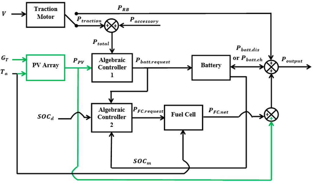Control block diagram of the PV/fuel cell/battery HRES under the “algebraic control” strategy. Black blocks and lines indicate components of the original control scheme [5]; green blocks and lines indicate modifications to the original control scheme introduced to accommodate the added PV array.