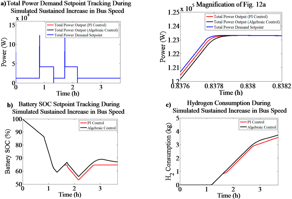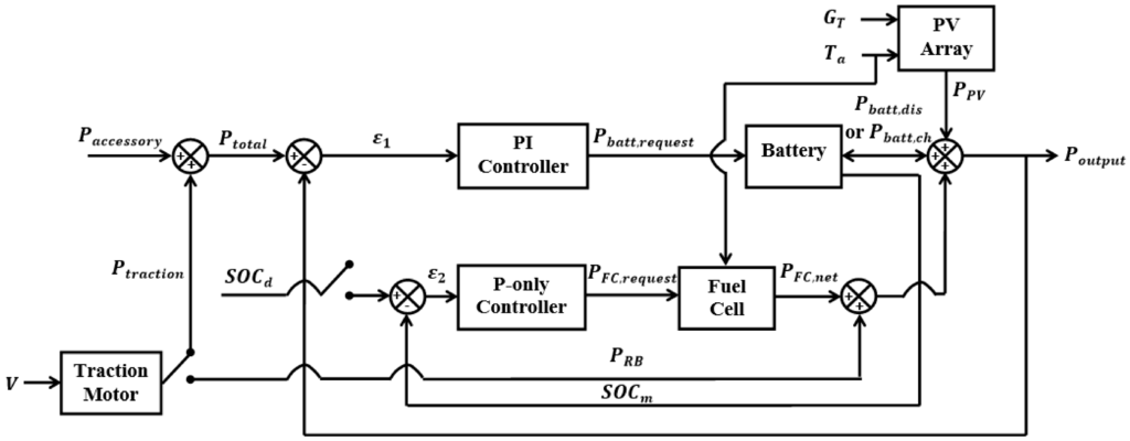 In this paper, we consider two separate control strategies: an “algebraic” control strategy (currently used on the bus [5]) and standard proportional-integral (PI) control. These control strategies retain the simplicity and computational efficiency of rule-based methods, while employing instantaneous system information without requiring a priori knowledge of the drive cycle. As discussed shortly, the “algebraic” control strategy is so-called because it consists of algebraic expressions for determining, based on straightforward logic, the appropriate control action (battery power request and fuel cell power request) needed to meet the bus’s operating objectives. The original algebraic control strategy was designed specifically to enable the fuel cell/battery HRES meet bus operating objectives under normal operating conditions only (i.e., during typical shuttle runs). Although the strategy can be extended to include PV power as well, such a control strategy may not be effective in enabling the bus meet its operating objectives under other operating conditions (e.g., sustained increase in bus speed) that are not represented in the simple logic behind the algebraic controller equations.